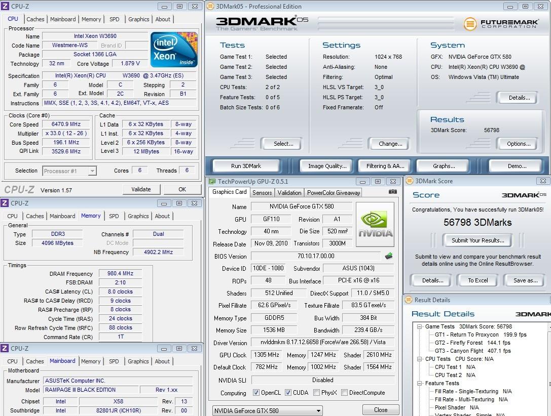 3Dmark05 с отключенным Hyper-Threading процессор смог пройти на частоте 6470 МГц. Видеокарта при этом также охлаждалась жидким азотом. Температура работы графического ядра была -120 градусов по Цельсию. А пройти целиком тест удалось на частотах 1300 МГц по ядру и 1250 МГц по памяти. Итоговый результат составил 56 798 marks.