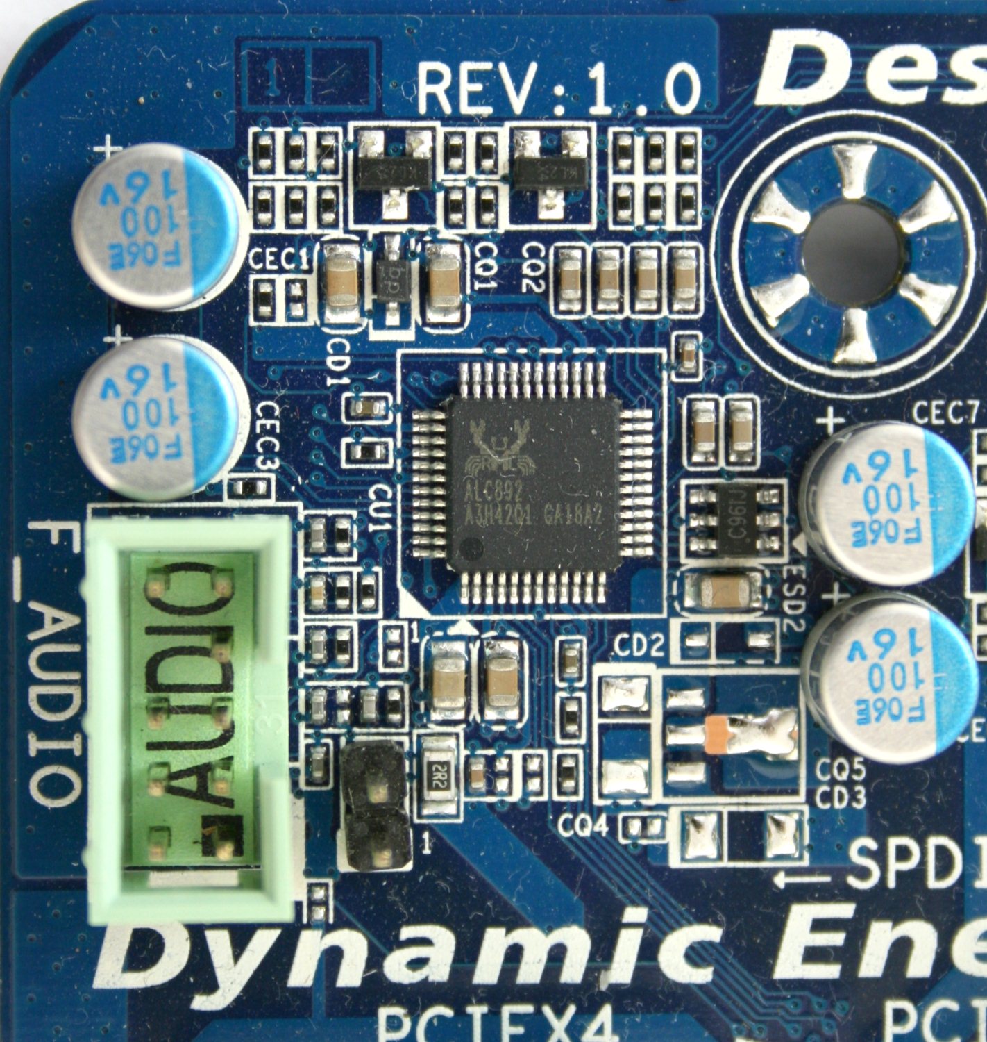 Левый нижний угол оккупирован звуковым кодеком. По нижнему краю распаян разъём передней аудиопанели.