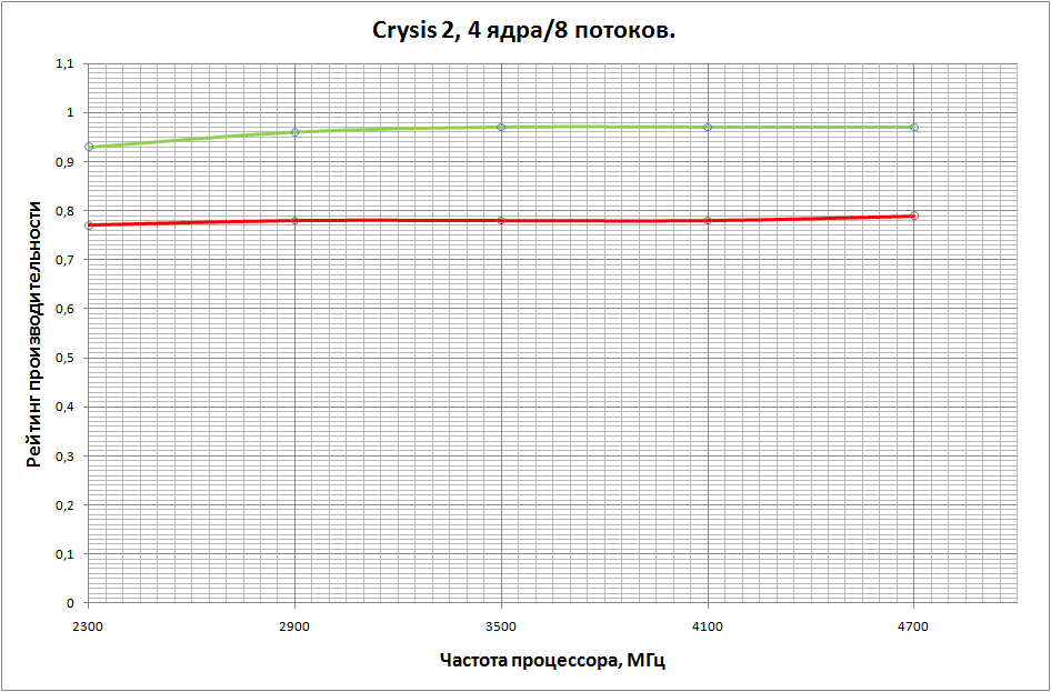 По сравнению с предыдущими графиками есть некоторые изменения. После определенного порога частот процессора (3600 МГц) производительность HD 6970 начинает падать при сопоставлении с GTX 580 опережающими темпами, в итоге при частоте CPU ниже 2600 МГц линии графиков пересекаются, и при дальнейшем её снижении более высокие результаты показывает GTX 580.