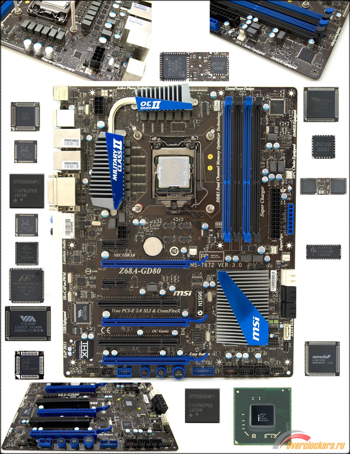 Intel Z68 лишён нескольких важных интерфейсов - USB 3.0, PCI. Но разработчики нашли способ расширить возможности материнских плат дочерними контроллерами. Нет смысла приводить отдельные иллюстрации, так как платы частично похожи ассортиментом и производителями контроллеров, поэтому приведу перечень используемых микросхем.