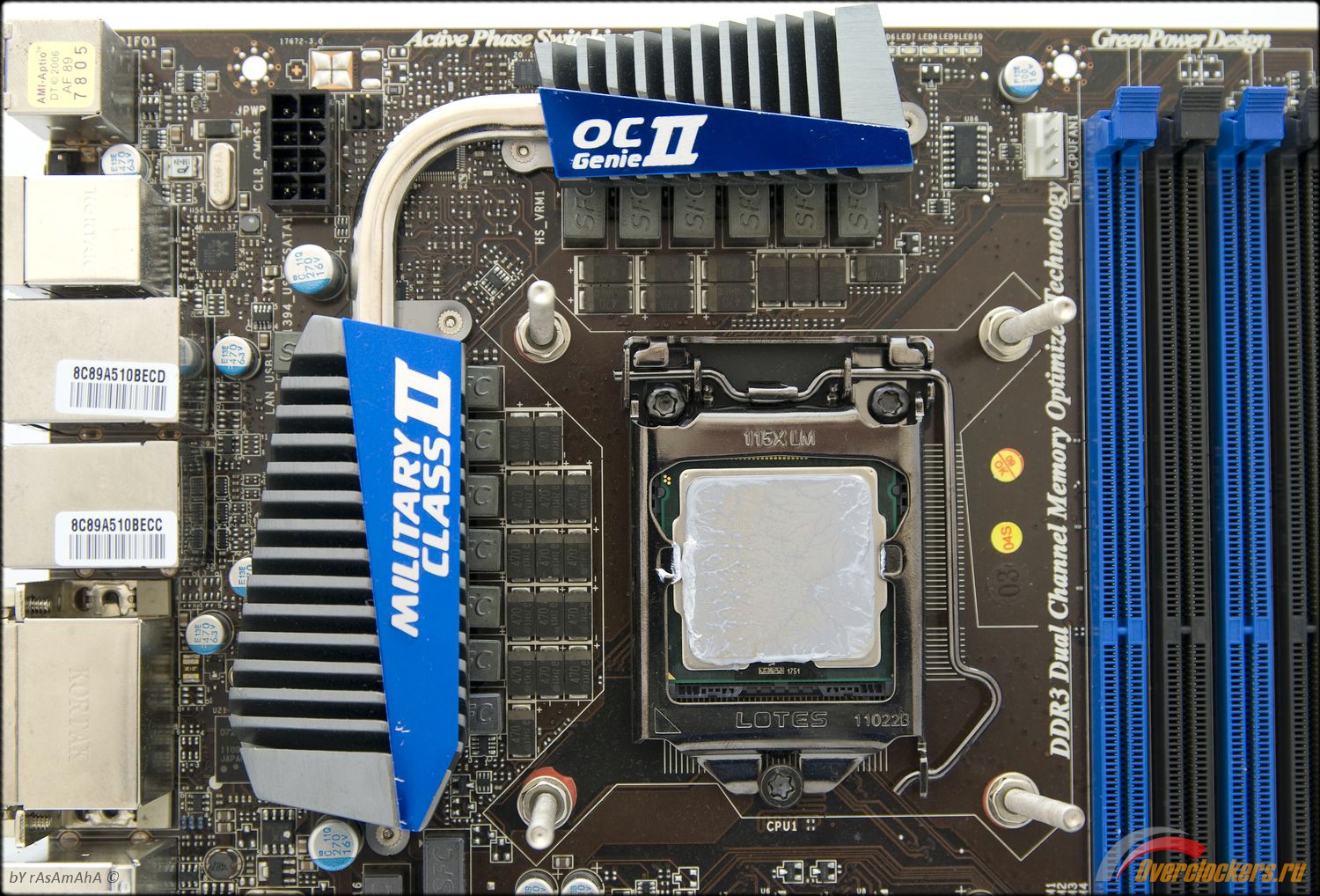 Голубенькие ленты на фотографиях ниже - термопрокладки. Площади СО с лихвой хватает на охлаждение зоны PWM даже без принудительного обдува вентилятором и при повышенном до 1.5 В напряжении, подаваемом на процессор.