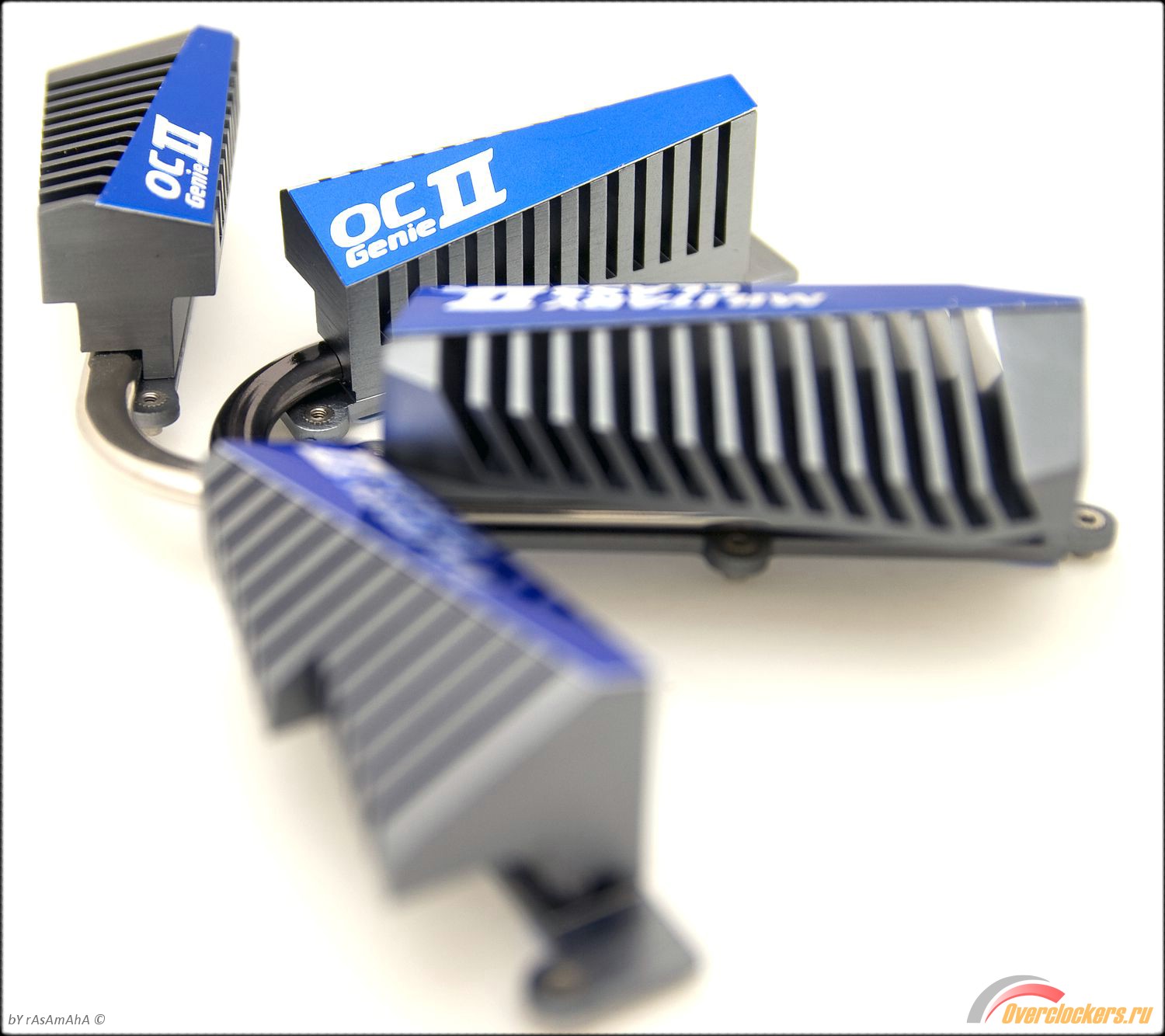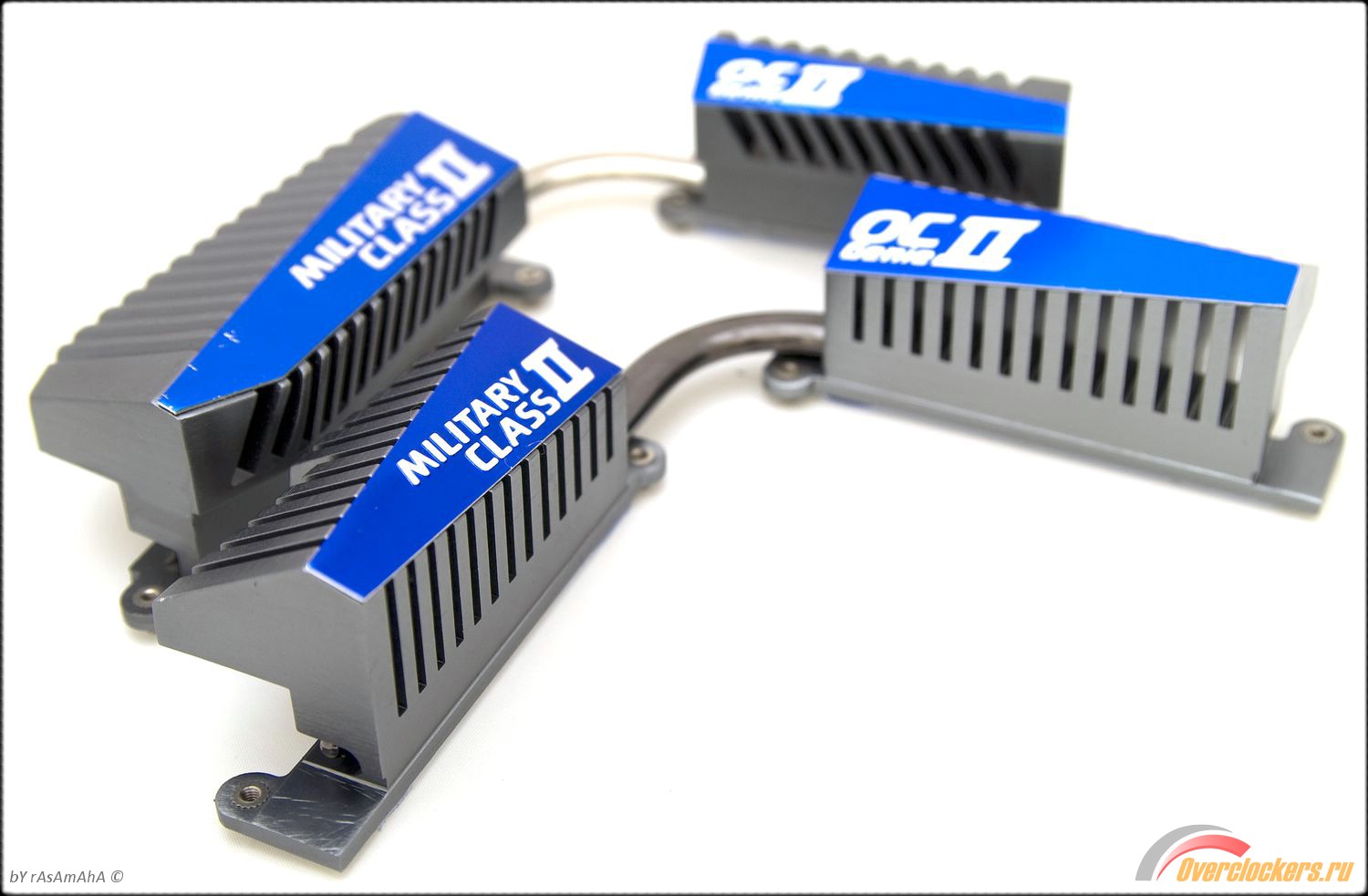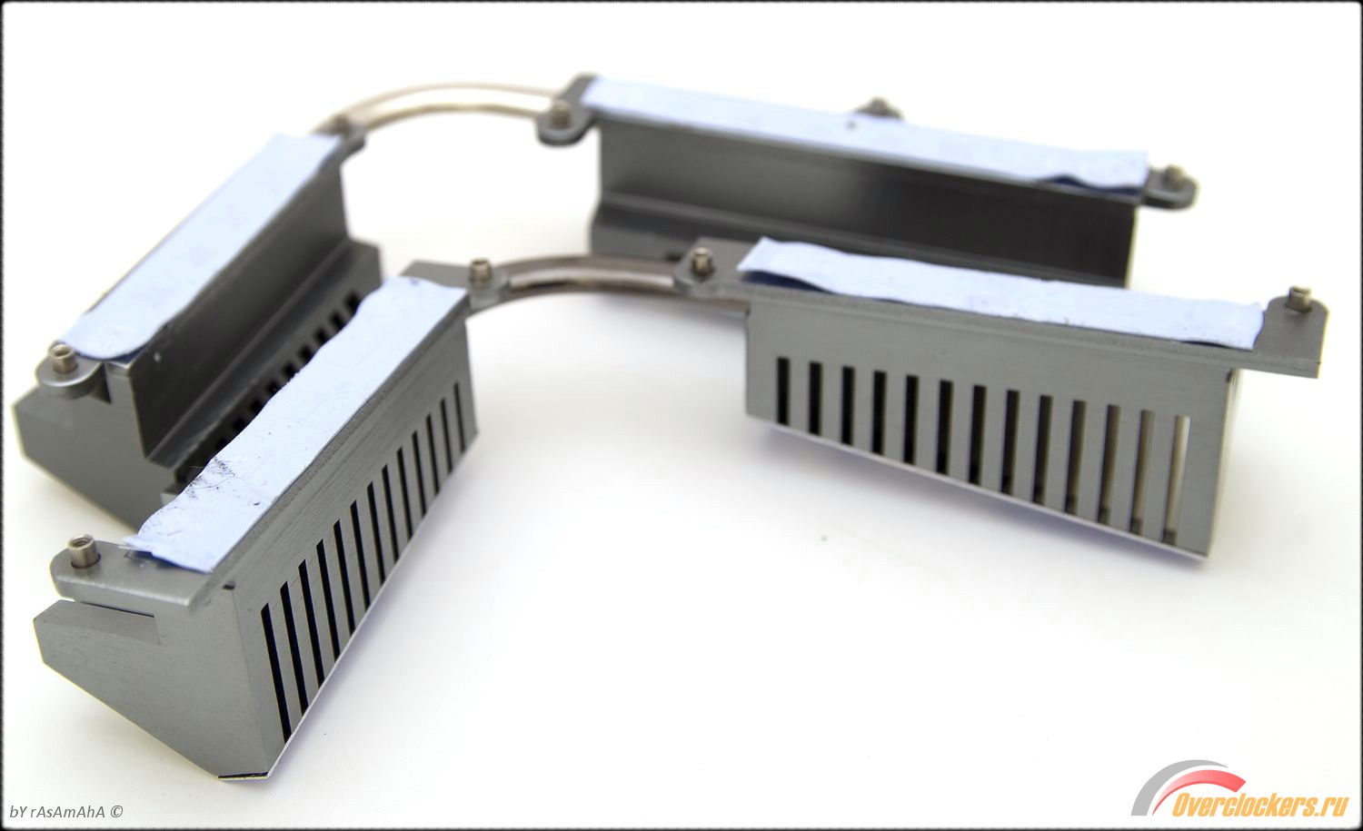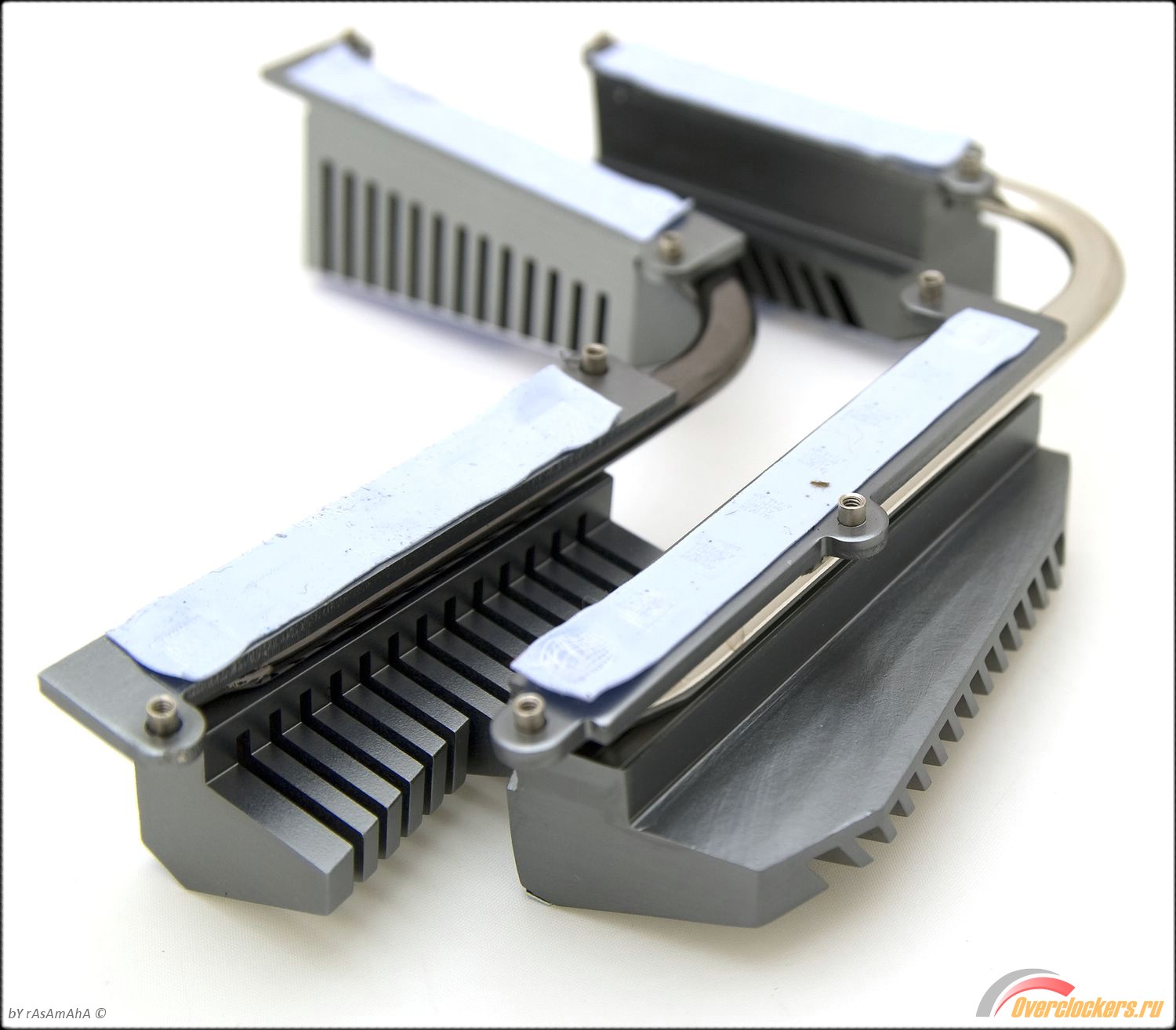 Система охлаждения обеих плат очень похожа и состоит из трёх алюминиевых радиаторов и одной медной тепловой трубки. Два теплосъемника охлаждают систему питания, они установлены на микросхемы DrMOS и соединены тепловой трубкой: