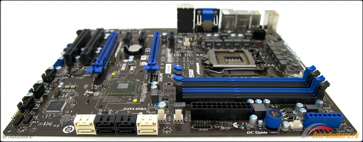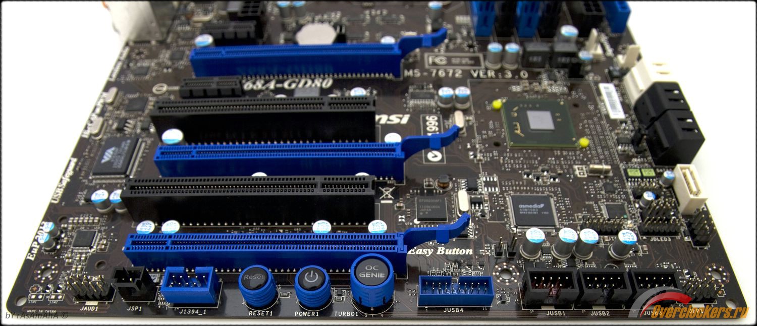 Как правило, они не работает одновременно, но появление портов SATA III с SSD накопителями серьёзно повысило нагрузку на шину обмена данных. Да и USB 3.0 способен разогнаться до скоростей передачи в 100..180 Мбайт/сек. Для полной реализации всех возможностей производителю приходится выводить эксклюзивные PCI-e с адресацией непосредственно с северного моста, встроенного в процессор. Небольшое пояснение: PCI-E Gen3 на плате GD65 распространяется только на первый слот, второй - лишен его поддержки.