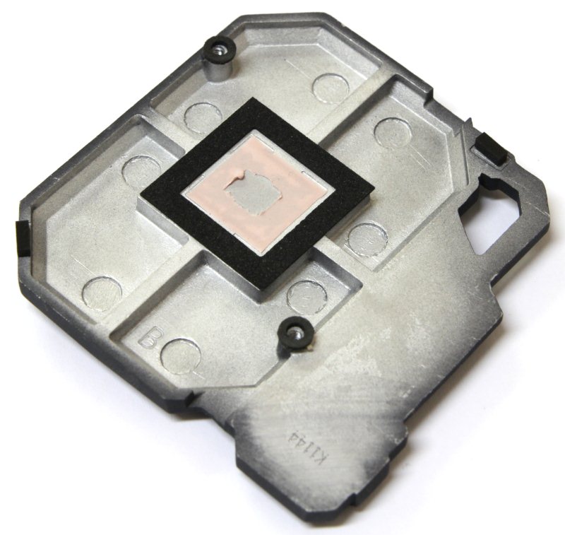 Тепловая трубка уложена в специальный паз и приклеена к радиаторам. В качестве термоинтерфейса используется светло-зелёная терморезинка и твёрдое серое вещество на радиаторе северного моста. Крепится вся система при помощи подпружиненных винтов разного типа.