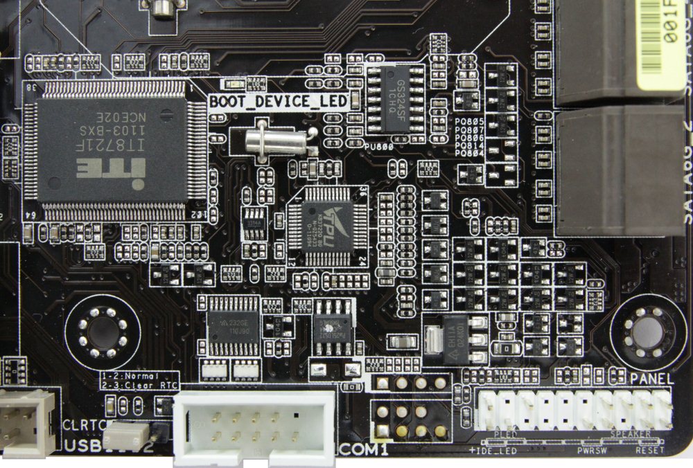 Рядом находится колодка COM порта, микросхема TPU, контроллер ввода/вывода и мониторинга ITE IT8721F, и джампер сброса настроек BIOS.