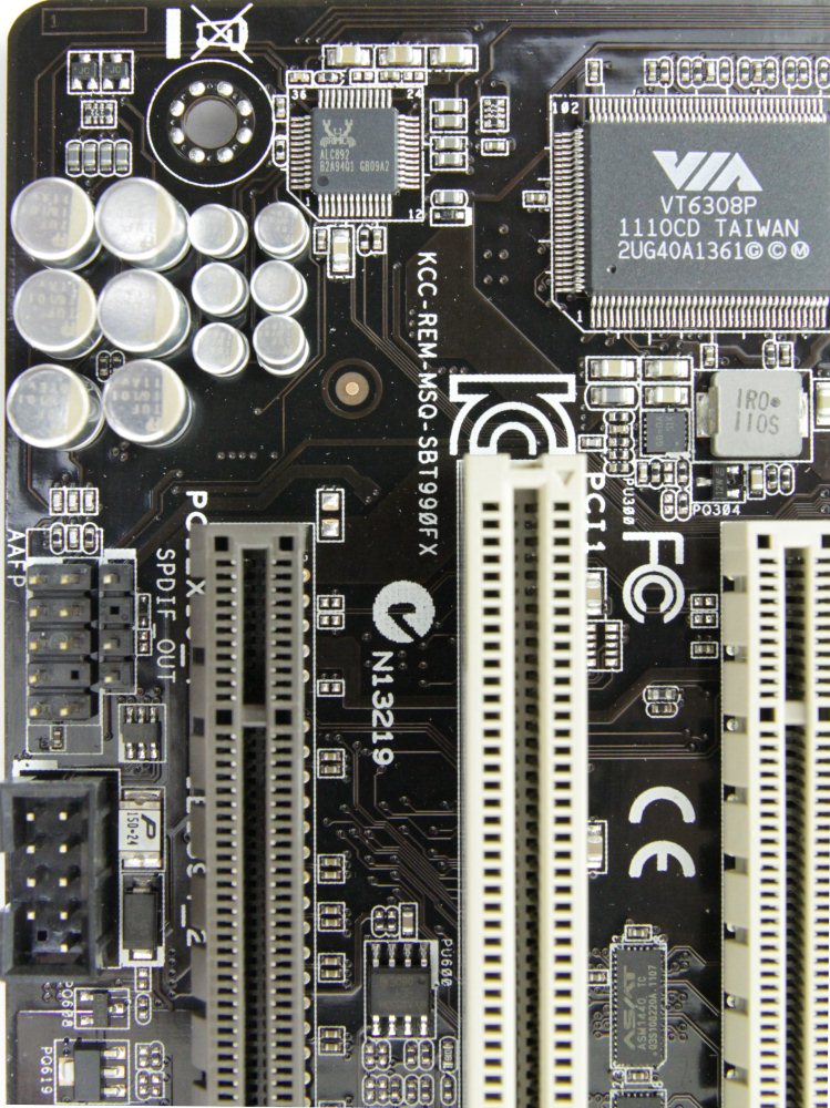 В левом нижнем углу размещен восьмиканальный звуковой кодек Realtek ALC892. Недалеко от него по нижнему краю можно обнаружить следующие разъёмы: SPDIF Out, передней аудиопанели и IEEE1394. Последний реализован контроллером VIA VT6308P, который распаян неподалёку.