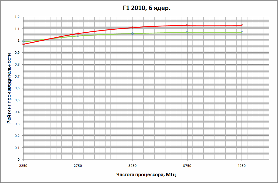 HD 6970 при переходе от шести ядер к четырём потеряла больше, как следствие, на частоте процессора ~2500 МГц уже можно наблюдать точку пересечения линий графиков, и при дальнейшем снижении частот лидерство остаётся уже за GTX 580.