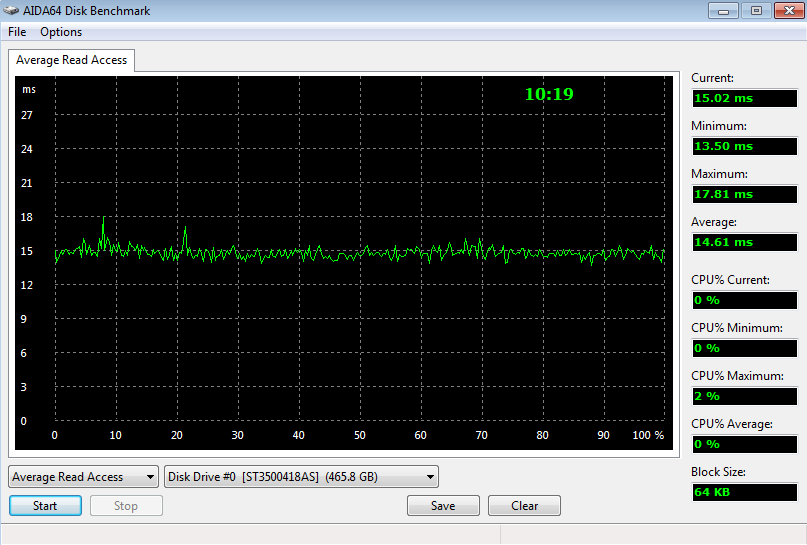 Для разогрева жесткого диска применялась программа AIDA64 v1.80.1484. Использовался тестовый бенчмарк жесткого диска в режиме Average Read Access, поскольку именно он наиболее сильно разогревает дисковую подсистему. Время тестирования составляло тридцать минут (три прогона по десять минут). Температурные показатели с жесткого диска снимались с помощью этой же программы.