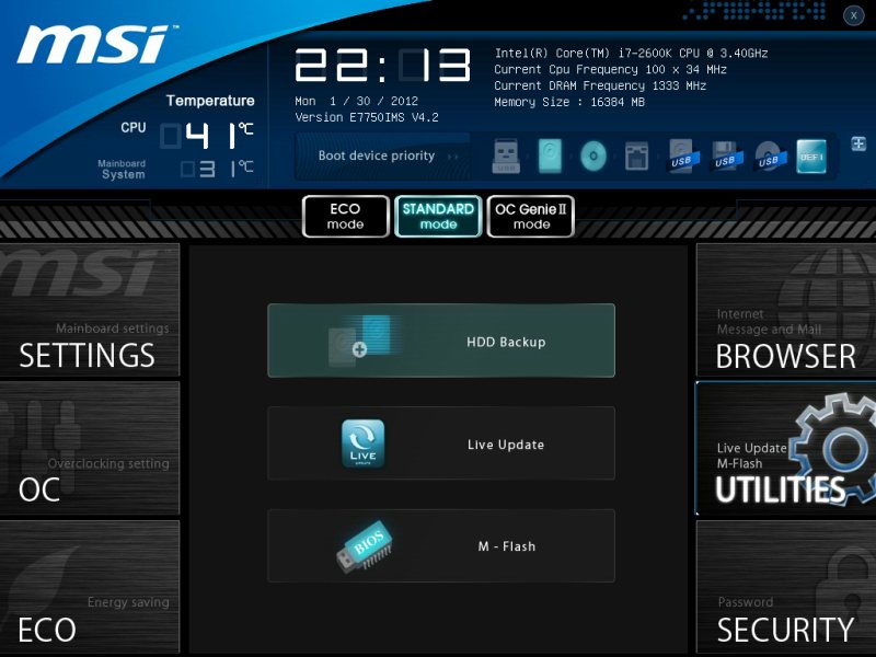 Открывается окно с тремя пунктами утилит: HDD Backup, Live Update и M-Flash. Нижней я и воспользовался для обновления BIOS.