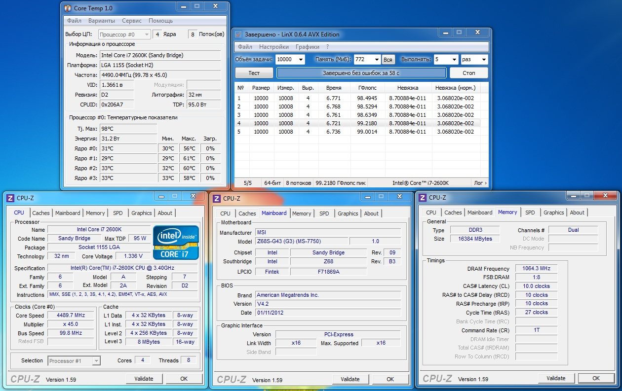 Тестирование MSI Z68S-G43 (G3) проводилось на открытом стенде при комнатной температуре 22°C в следующих режимах:
