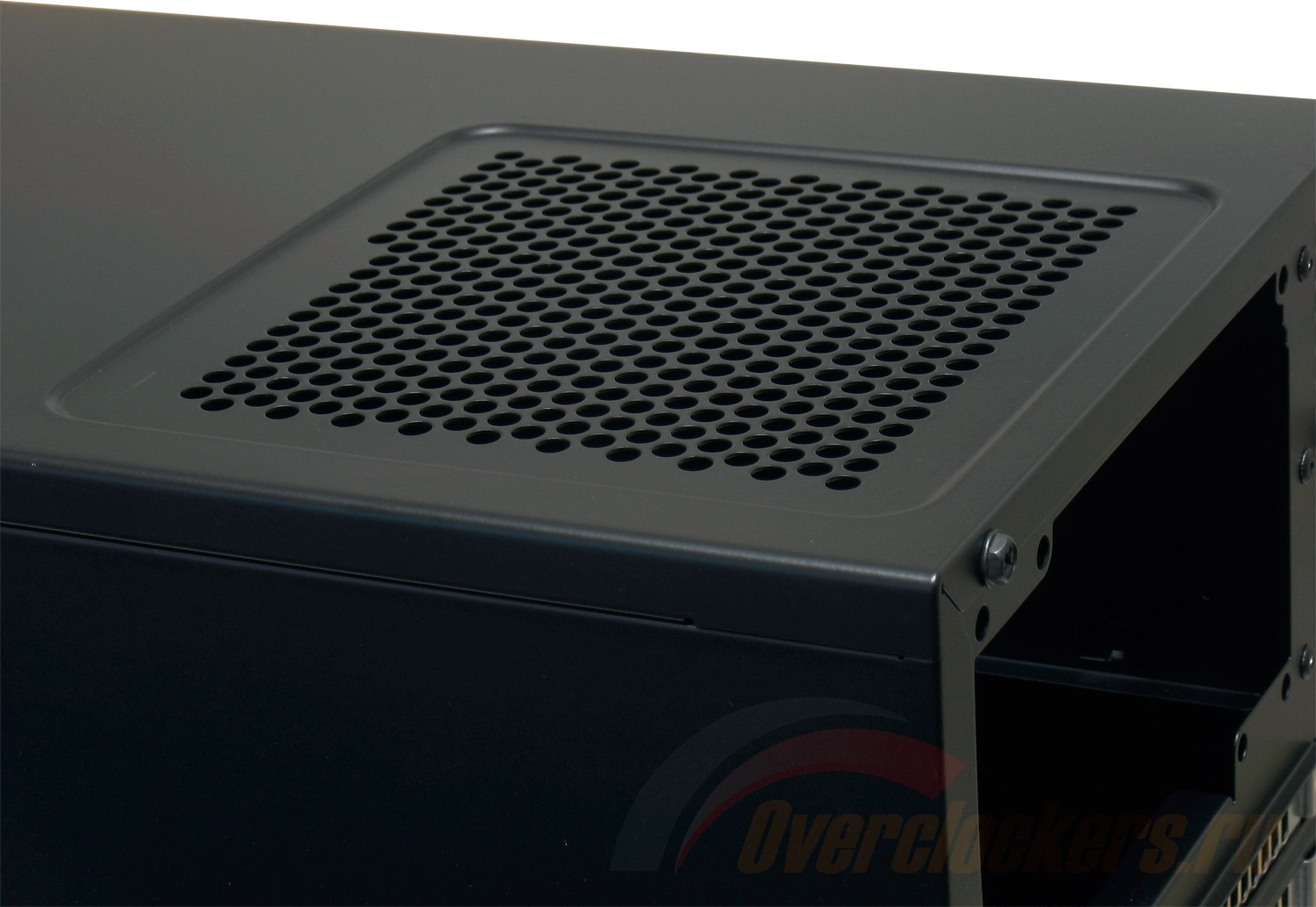 В верхней задней части располагается блок питания, который по задумке должен размещаться вентилятором кверху и производить забор прохладного воздуха через расположенную над ним решетку. Четыре отсека для карт расширения закрыты съемными никелированными заглушками с наличием вентиляционных отверстий. Под ними расположен и отсек для I/O заглушки материнской платы. В самом низу находится посадочное место под 120 мм вентилятор, который в комплект поставки не входит.