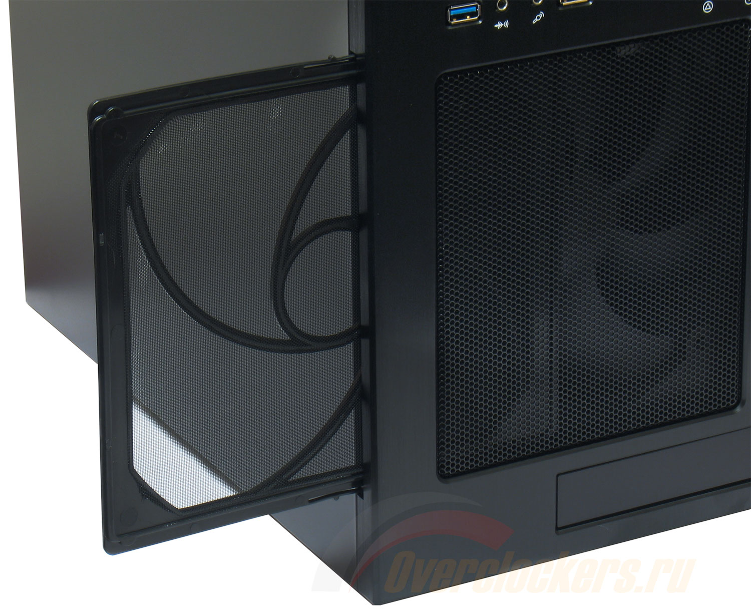 На фронтальной панели корпуса также присутствует подобный фильтр, защищающий от пыли, но размером он куда больше (соответствует вентилятору) и снимается сдвигом вбок, в любую из сторон. Магниты в этом случае отсутствуют.