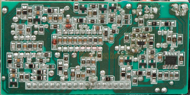 На обратной стороне основной печатной платы распаяно множество фильтрующих керамических конденсаторов в каналах +3.3, +5 и +12.