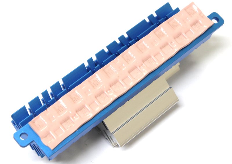 Нижняя часть голубого цвета контактирует с силовыми элементами через мягкую, розовую термопрокладку толщиной около 1 мм. Верхняя часть не окрашена, поэтому видна её металлическая база, покрытая тонким лаком. Стыкуются они пазами и склеены между собой. Крепление всей конструкции производится двумя подпружиненными винтами к алюминиевой планке с обратной стороны, также накрывающей мосфеты.