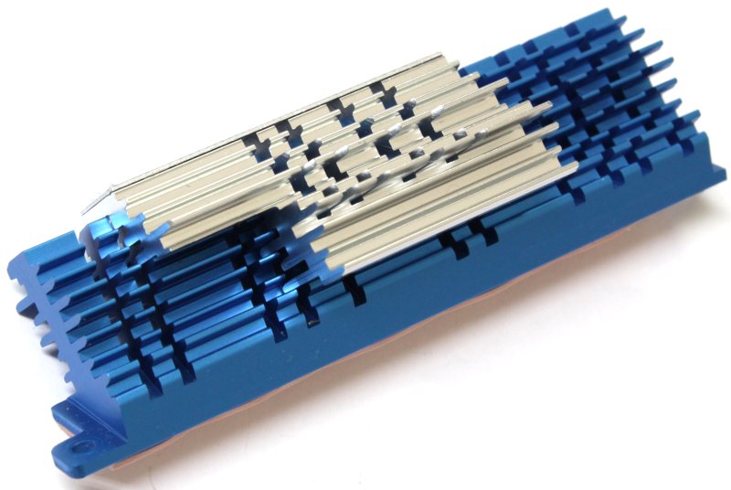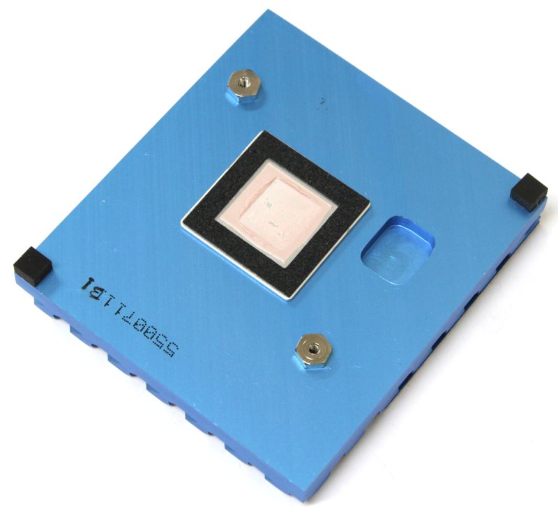 Он также изготовлен из алюминия и трёх частей. Снизу это небольшое основание из того же металла, приклеенное к основному телу радиатора. Сверху всю конструкцию венчает пластинка с логотипом производителя. Рёбра радиатора нечастые, невысокие и проходят по диагонали. С обратной стороны можно увидеть две приклеенные стальные гайки, защитную рамку из мягкого пористого материала около места контакта и два ограничительных кубика для избегания перекосов. В качестве термоинтерфейса по традиции используется розовая «терможвачка».
