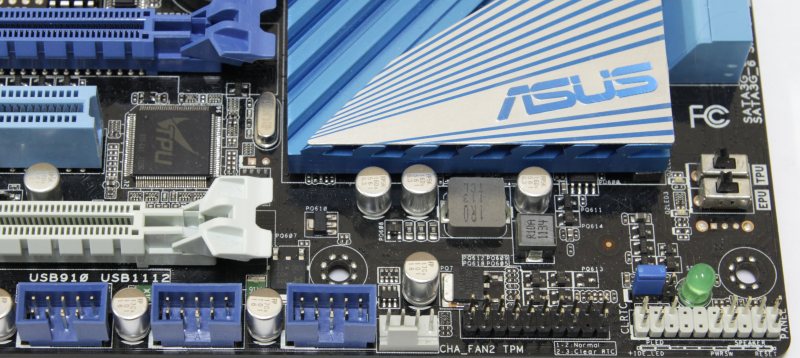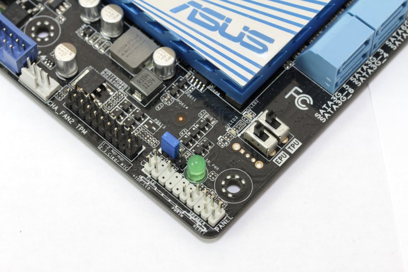 Неподалеку есть зелёный диод, показывающий наличие питания на плате, и джампер для сброса настроек BIOS. Кроме этого можно обнаружить два переключателя TPU и EPU, которые активируют соответствующие функции. Чуть левее по нижнему краю расположен штырьковый разъём для подключения TPM.