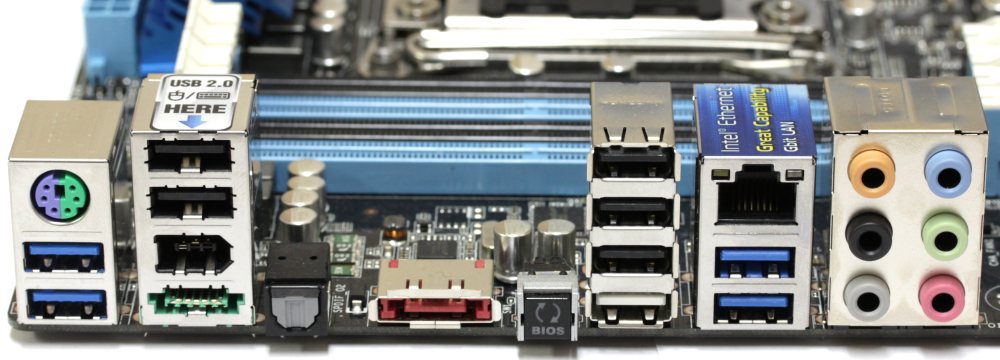 | Разъемы и кнопки задней панели | 1x PS/2 клавиатура или мышь 6x USB 2.0/1.1 3х USB 3.0 1x IEEE 1394 2x eSATA 1x RJ45 1x optical S/PDIF Out 6x 3,5 мм Jack 1x кнопка BIOS |