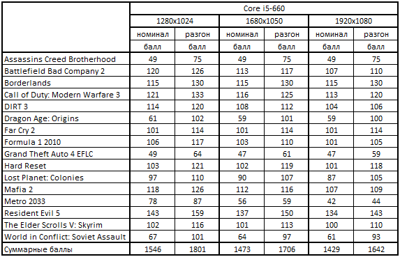 - медленнее Core i5-760 на 10% - 19% в 4 играх;