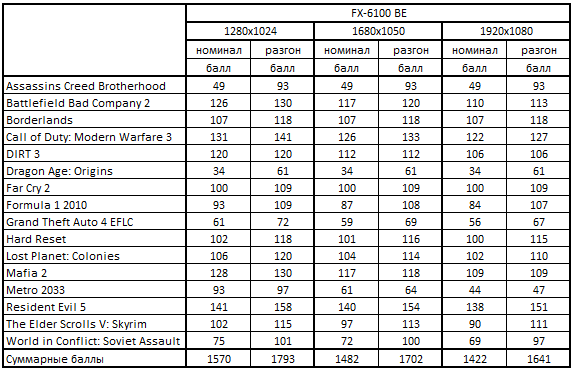 - медленнее Phenom II X6 1100T BE на 4% - 9% в 2 играх;