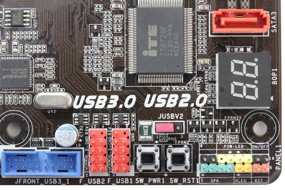 Внизу находятся две колодки USB 2.0 и одна USB 3.0. Первые реализованы интегрированным в южный мост контроллером, который поддерживает до четырнадцати таких портов. На плате их всего четыре в двух колодках и четыре на задней панели. Четыре порта USB 3.0 реализованы двумя контроллерами Asmedia ASM1042, которые распаяны недалеко от них.