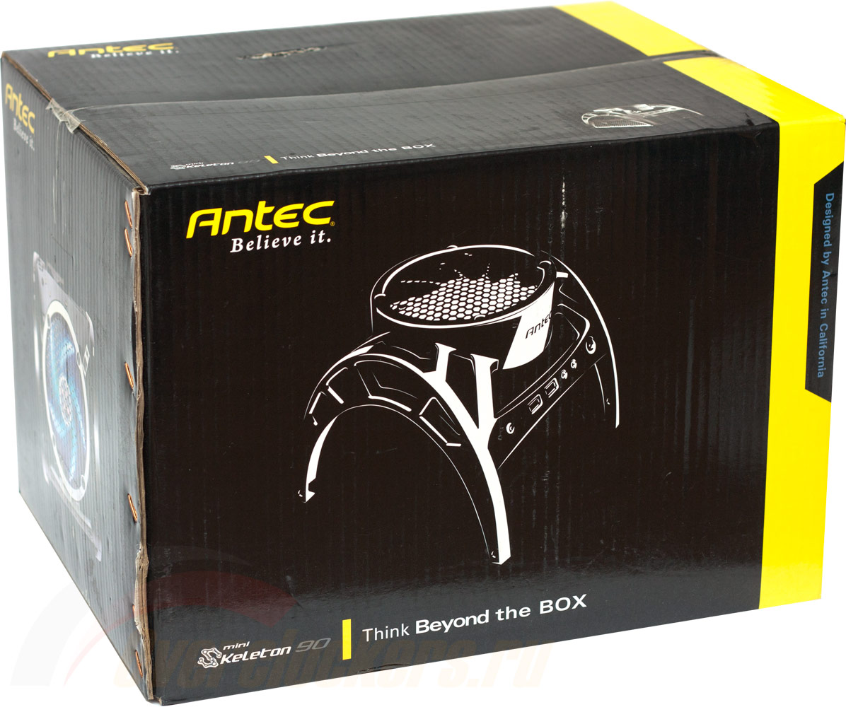 Antec Mini Skeleton-90 упакован в коробку совсем небольших размеров, ее габариты - 295 х 275 х 310 мм (Ш х В х Г). Выполнена упаковка в темных тонах, с изображением на боковых сторонах картинок корпуса. Отличительная черта – ярко-желтая полоса на торце коробки, ее наличие позволяет дизайну упаковки не погрязнуть в однообразии тонов.