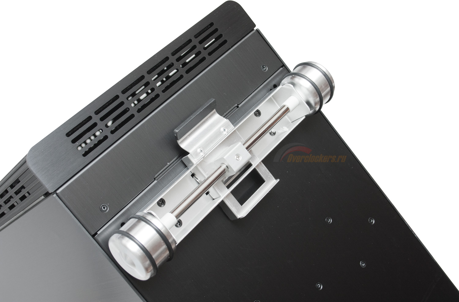 Дополнительно предусмотрен прижимной механизм, придерживающий установленные устройства расширения. В первую очередь это касается больших и тяжелых видеокарт. Однако в тестируемом корпусе воспользоваться данным приспособлением так и не удалось, по причине слишком сильно сдвинутой в левую сторону «балки» и упору ее в процессорный кулер. К слову, максимальная длина видеоускорителя составляет 335 мм с установленным на корзине для HDD вентилятором и 360 мм без него. В этом у Lian Li PC-V2120 конкурентов мало.