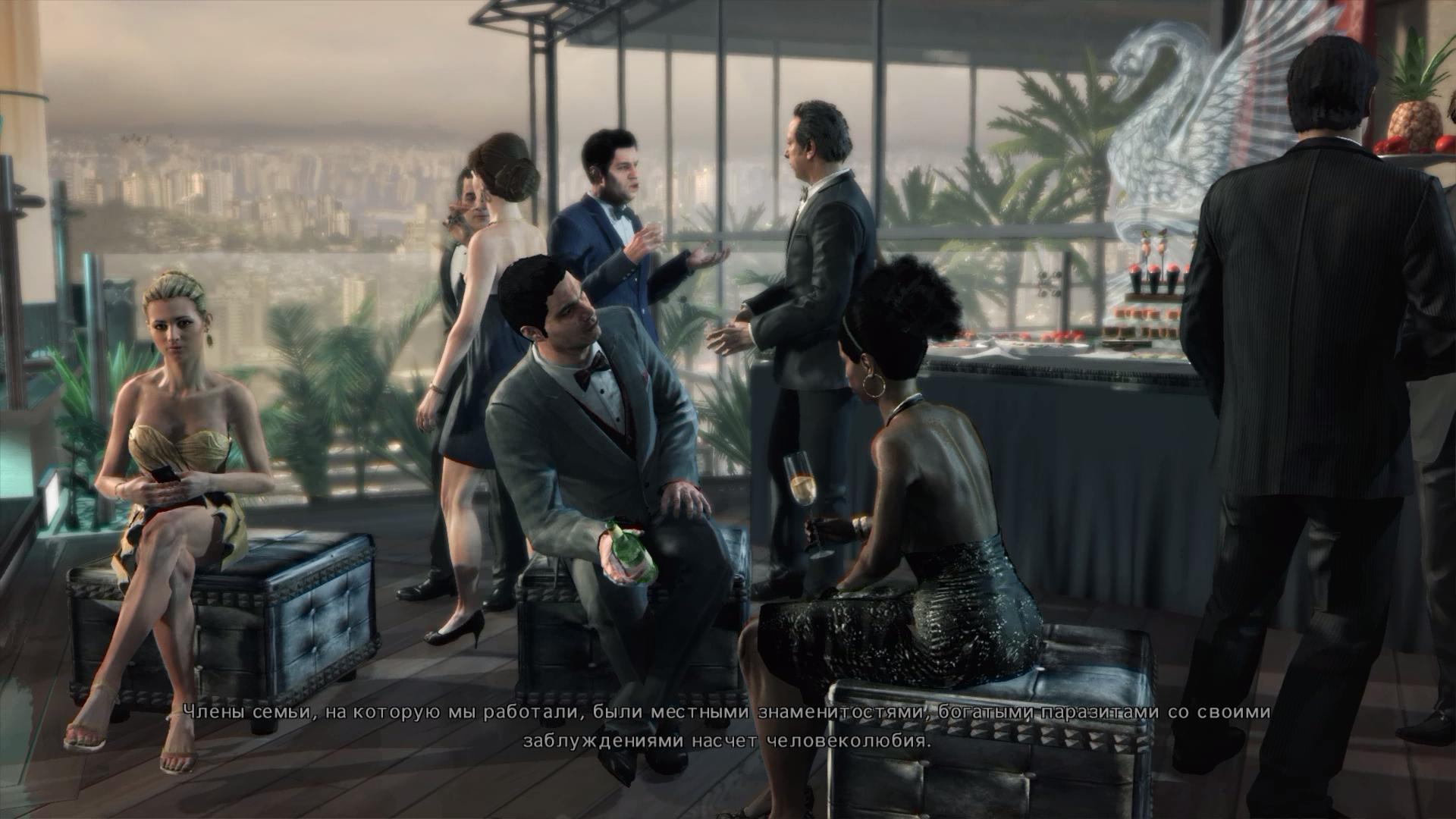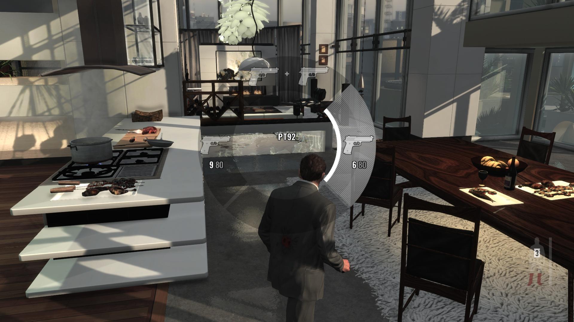 Расправившись с налетчиками, засевшими в роскошных апартаментах, и выйдя на балкон, Макс обнаружил внизу очередного бандита, взявшего в качестве живого щита жену Родриго. Воспользовавшись скатом крыши и не утратив сноровки, наш герой в скольжении снял мерзавца выстрелом в голову и благополучно приземлился в бассейн.