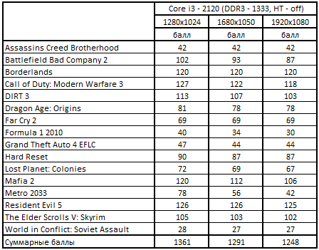 Активация Hyper-Threading для Core i3-2120 привела к увеличению производительности на 14-24% в зависимости от разрешения. Снижение частоты оперативной памяти с 1333 МГц до 1066 МГц снизило результаты на 2-4%.