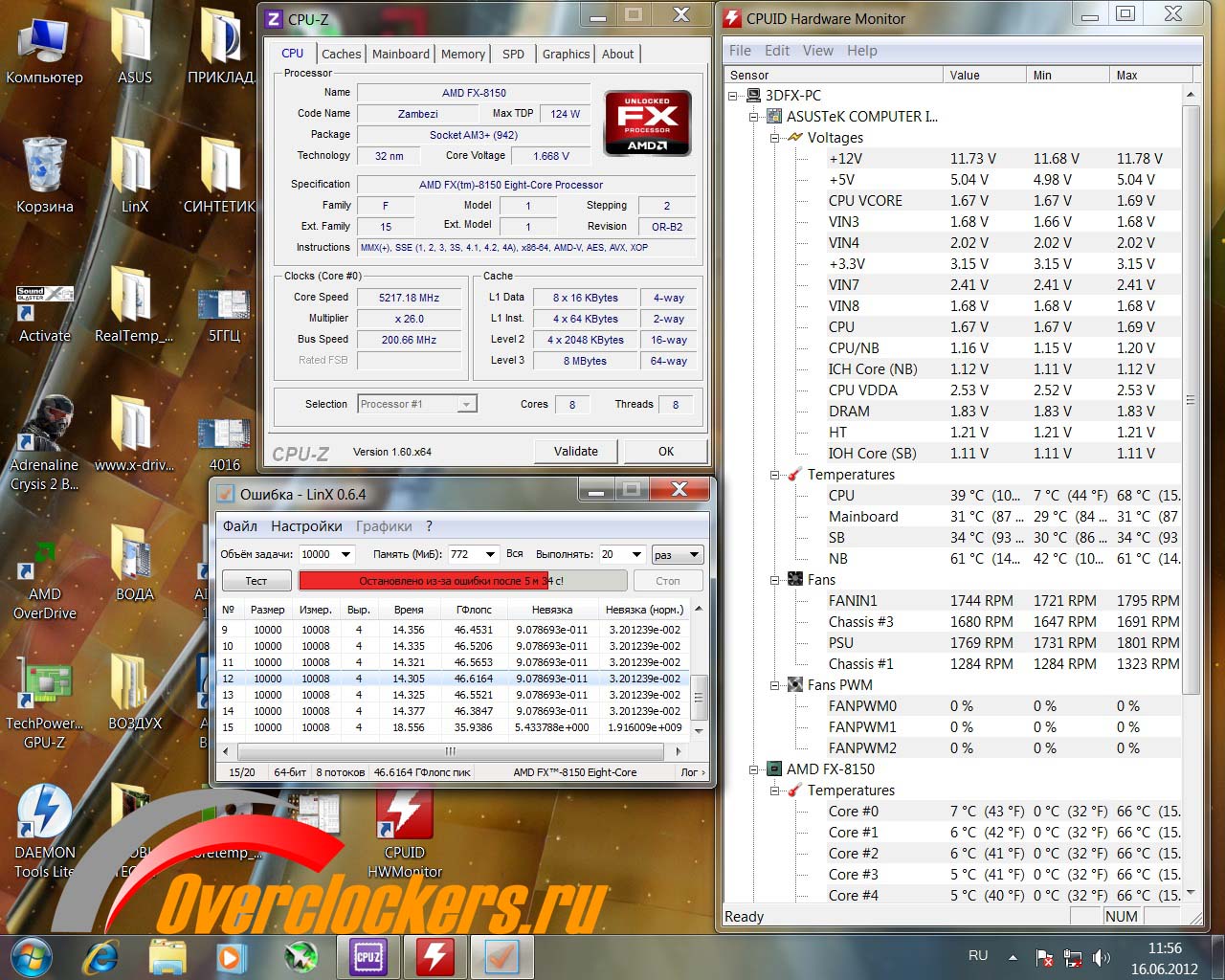 Температура AMD FX-8150 во время прогона LinX поднялась до 55 градусов! И это при температуре тосола от -17 до -15 градусов. Ничего себе холодный процессор! Но и напряжение не детское.