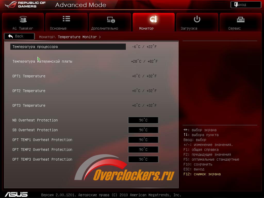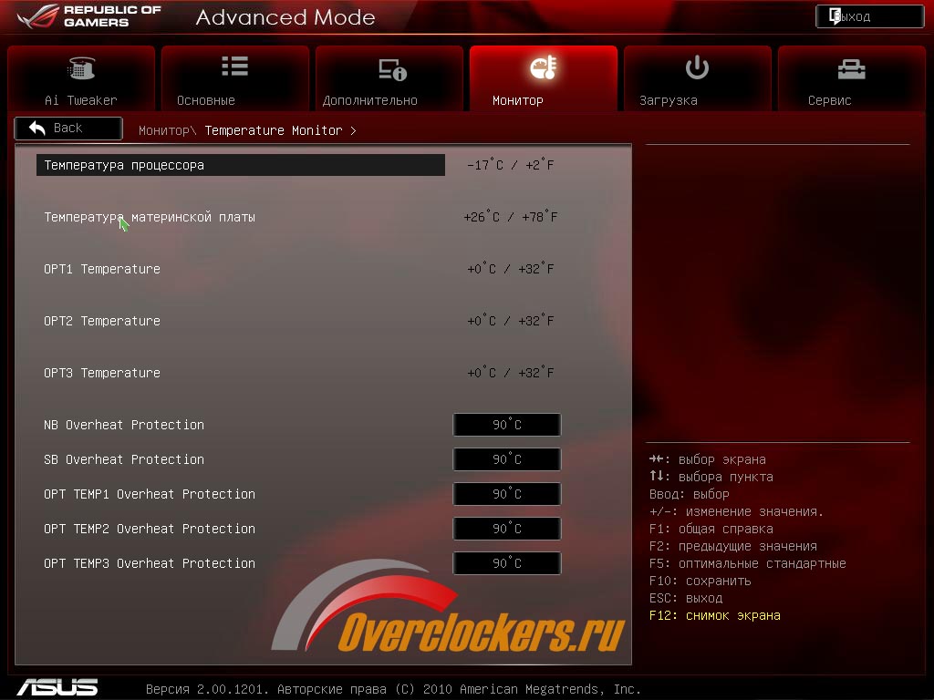 После включения стенда сразу лезу в BIOS, раздел «Мониторинг». Смотрю температуру процессора. Плюс 6. Ого! Температура тосола -17 (немного просела под нагрузкой), а процессор +6. Однако, ну и тепловыделение у Bulldozer’а!