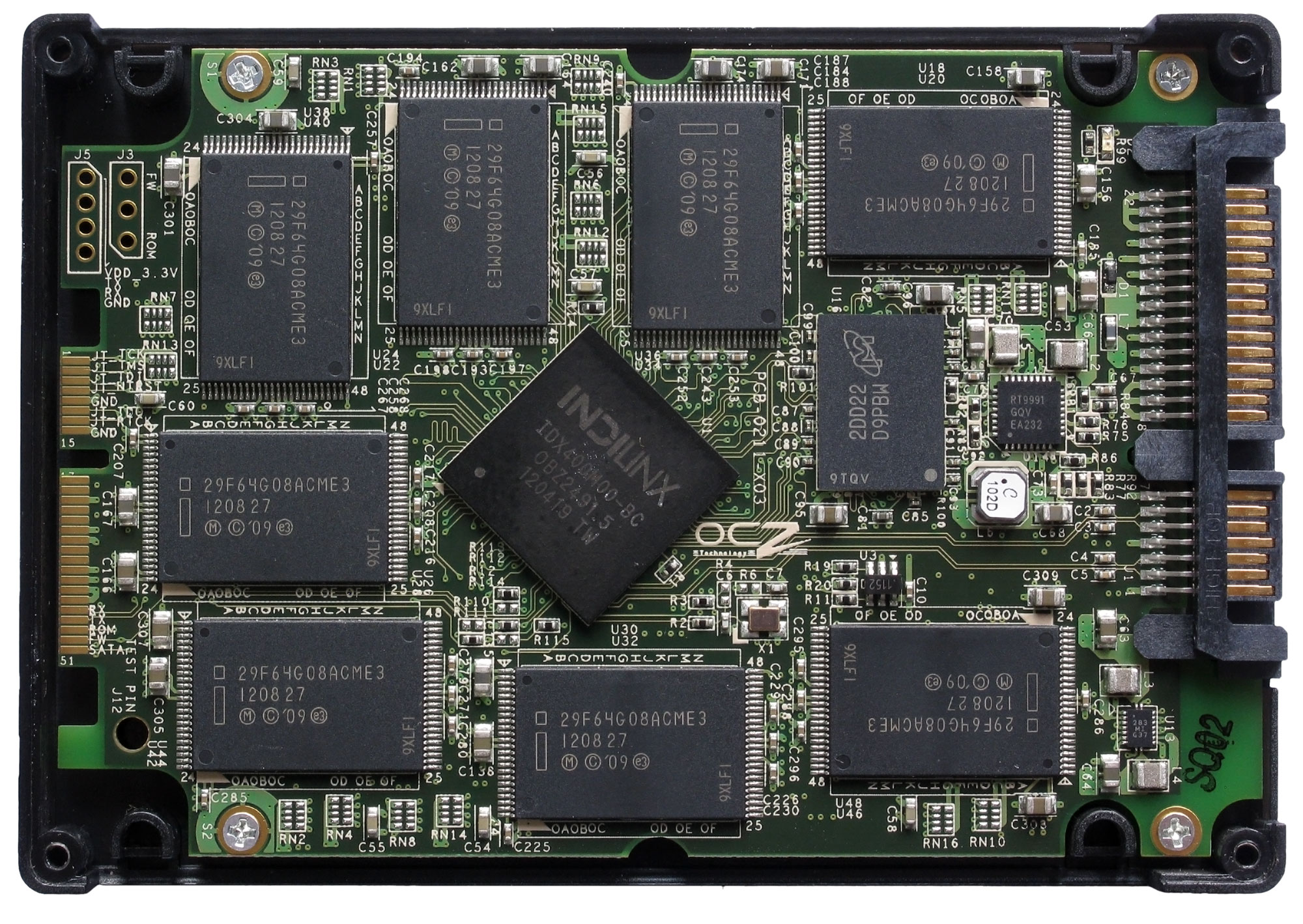 Отчетливо виден контроллер с маркировкой IDX400M00-BC, двухгигабитный чип кэша H5TQ2G63BFR-H9C производства Hynix и восемь микросхем флэш-памяти M2502128T048SX22 по 128 Гбит каждая с логотипом OCZ. Интернет подсказал, что в них скрываются кристаллы производства Micron. Интересно смотрится сервисный порт, похожий на SATA, но отличающийся размерами и числом контактов.