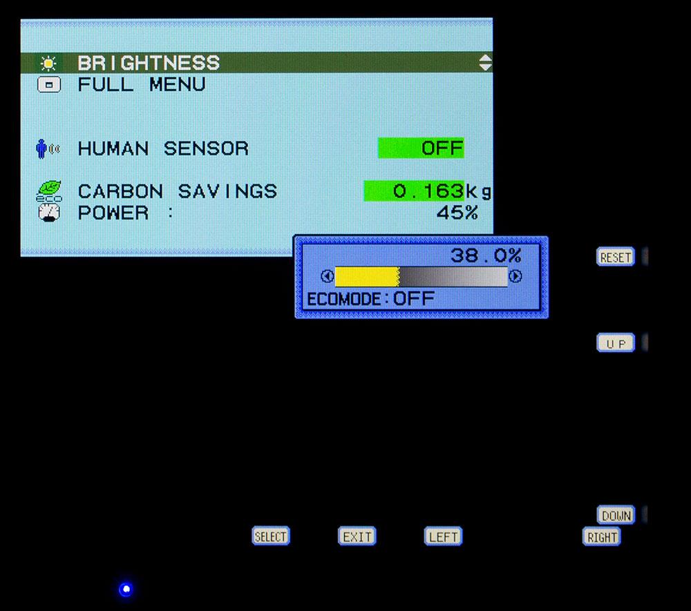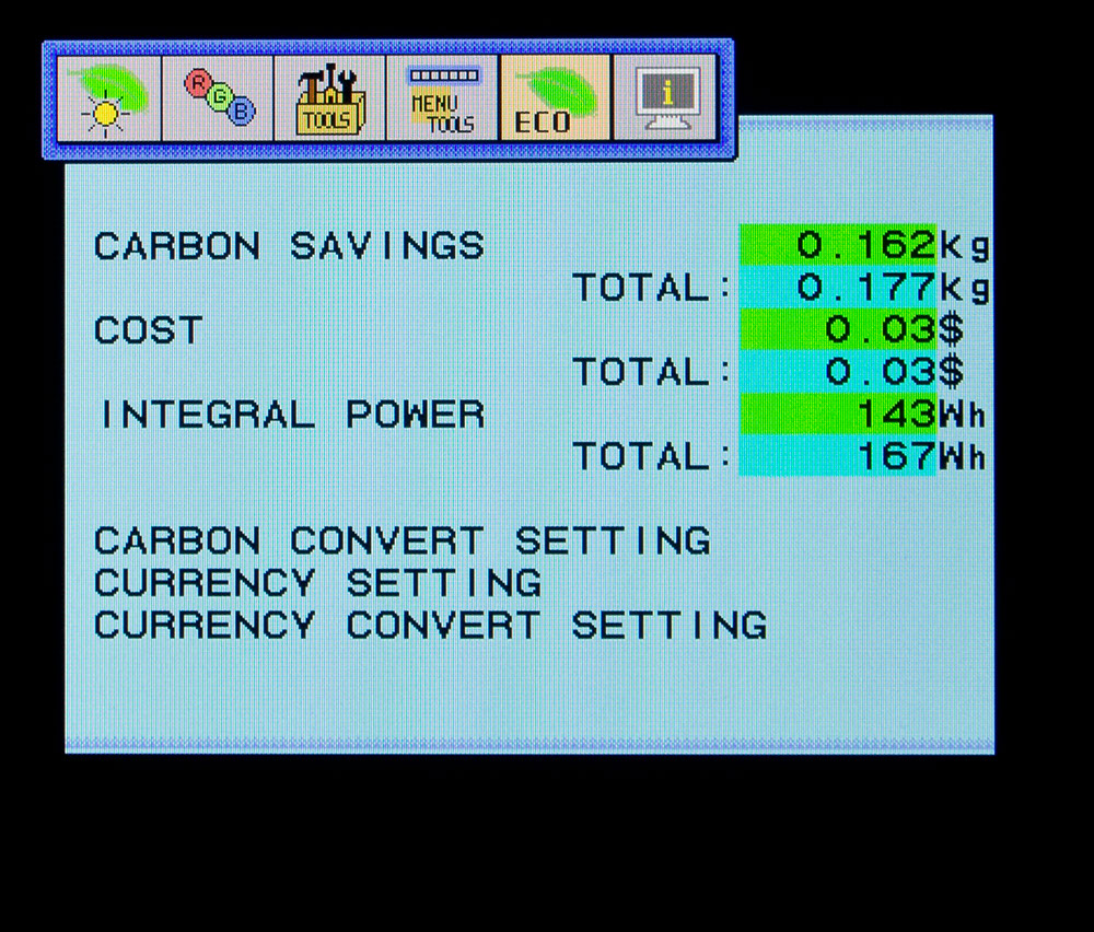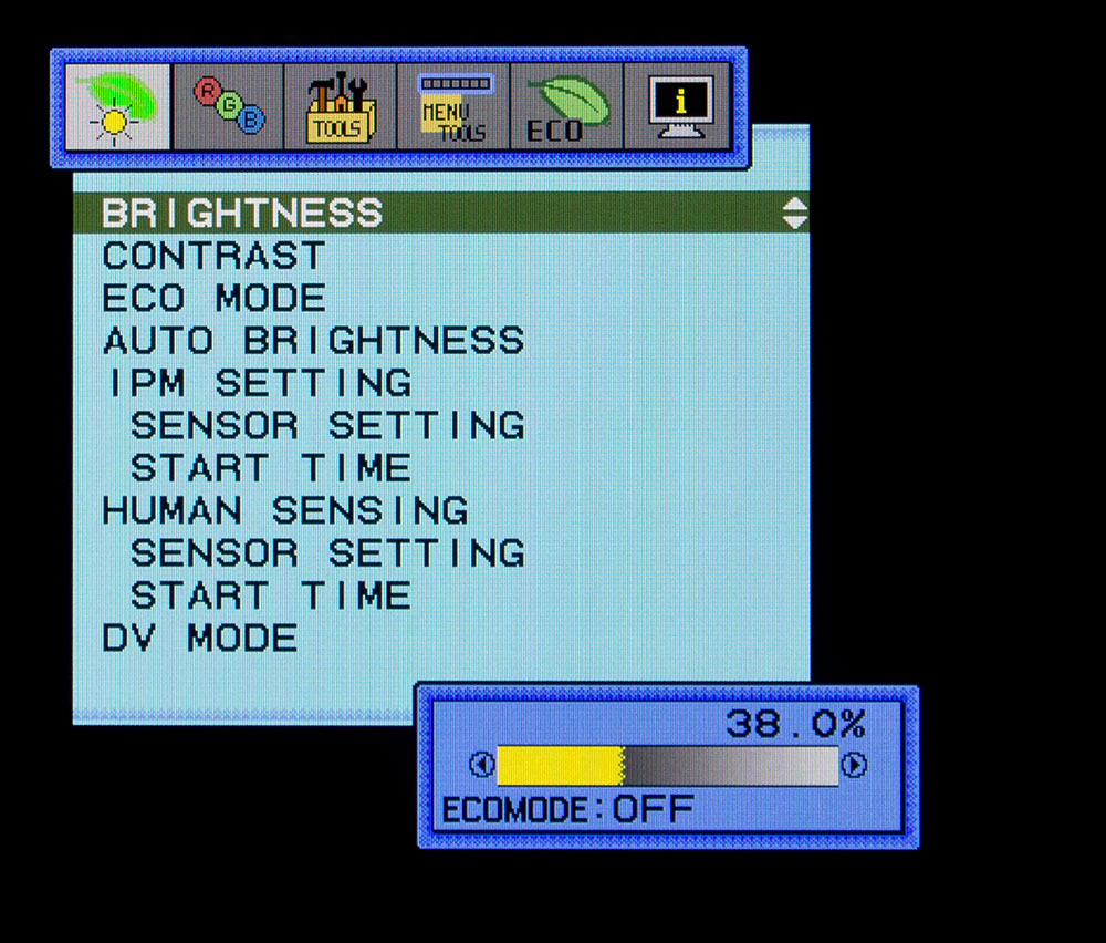 Быстро изменить источник сигнала и активировать ECO функции – это, пожалуй, единственное, что возможно выполнить без входа в основное меню. Более того, при первом нажатии на соответствующую область (Menu) на экране появится его сокращенная версия, которая даст возможность изменить яркость экрана, активировать датчик присутствия и посмотреть как “сильно” вы помогли сберечь природу. В целом – ничего интересного. А поэтому сразу перейдем к Full Menu.