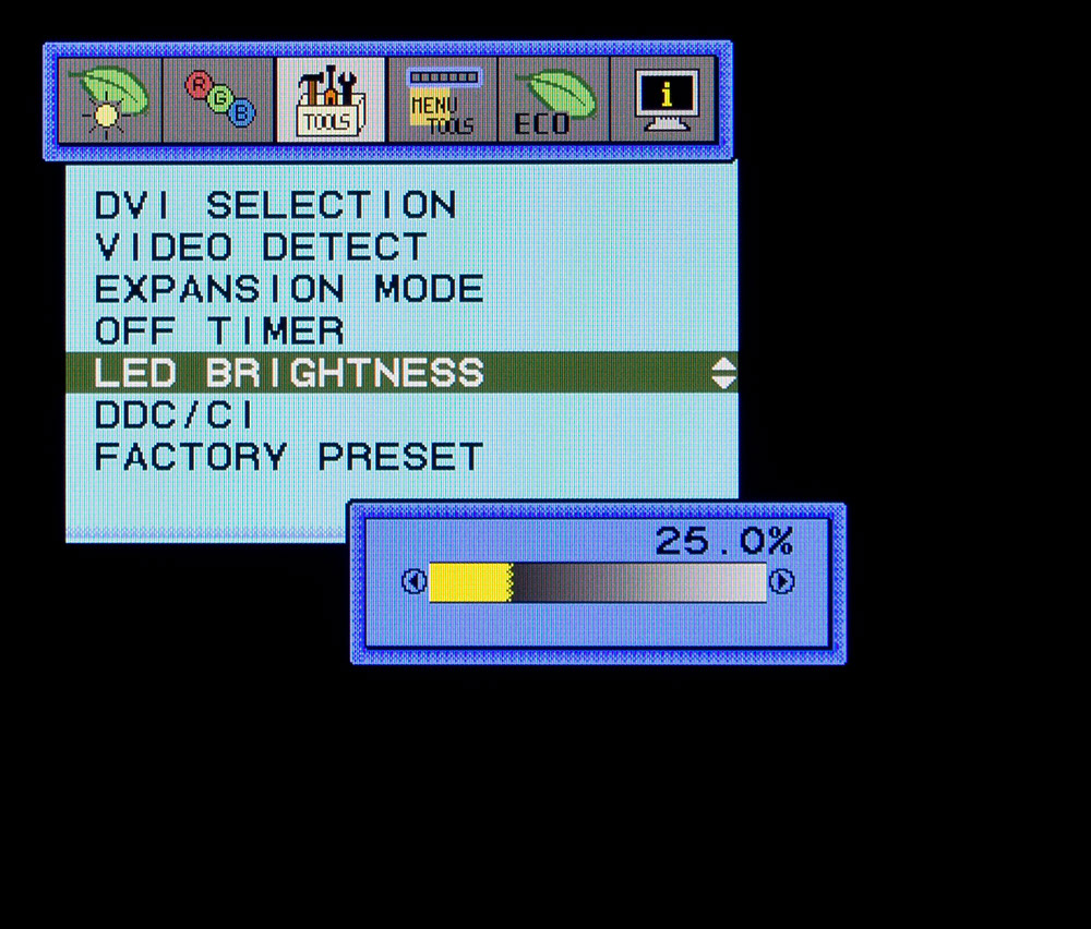 Сброс настроек к значениям по умолчанию, регулировка яркости индикатора питания, отключение интерфейса передачи данных DDC/CI, установка времени автоматического выключения, настройка работы “скалера” (Full и Aspect) – для этого необходимо перейти в раздел Tools. В нем же возможно выбрать тип источника при использовании интерфейса DVI-I (Analog или Digital) и отключить автоматическое определение видео сигнала.