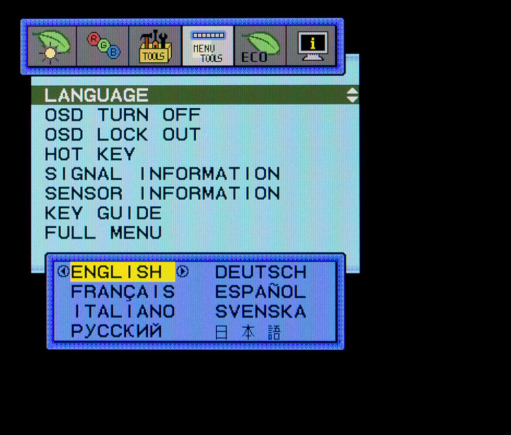 Различные настройки связанные с видом меню и навигации по нему представлены в разделе Menu Tools. В нем можно изменить язык локализации (Русский присутствует), отключить “горячие” клавиши, дезактивировать возникающие подсказки или надписи на экране во время пропадания сигнала, смены разрешения или подключения нового источника и, конечно же, снова перейти в упрощенное OSD меню.