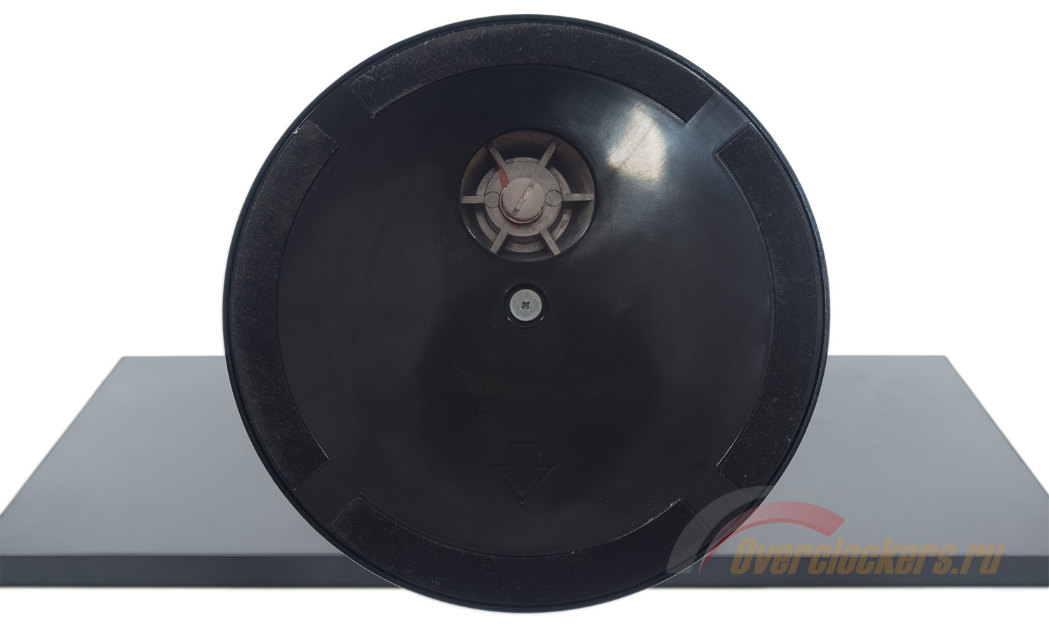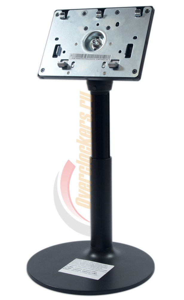 Круглое основание подставки обладает небольшими габаритами. На нее наклеен стикер, призывающий к вниманию (на нескольких языках) – необходимо надлежащим образом закрутить винты. Крепление центральной стойки смещено назад. При этом поворотный механизм никак не связан с ней и работает сам по себе. Поверхность подставки ровная, а поэтому может быть использована в качестве места для размещения мобильного телефона и прочих часто используемых гаджетов.