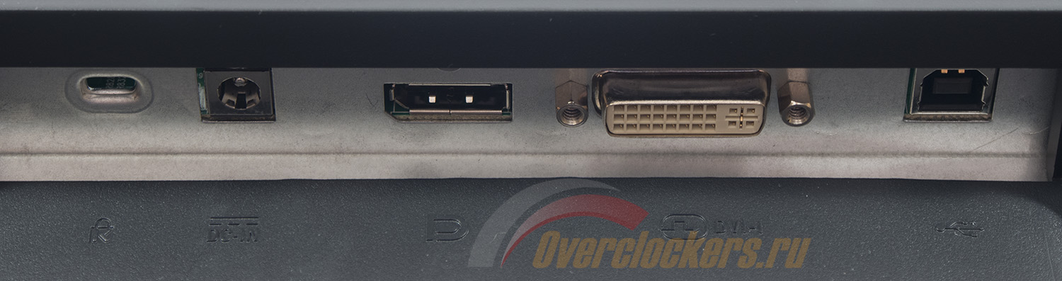 В задней части EX231Wp расположена колодка со следующими входами: питание, Display Port, DVI-I и выход USB для подключения к ПК (кабель идет в комплекте, необходимо для работы встроенного USB 2.0 порта в верхней части). От древнего аналогового D-Sub решили отказаться. Кнопка включения и выключения питания отсутствует.