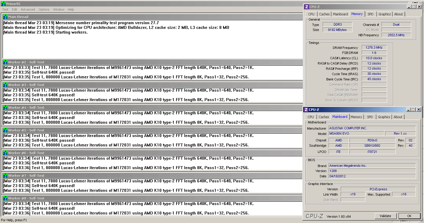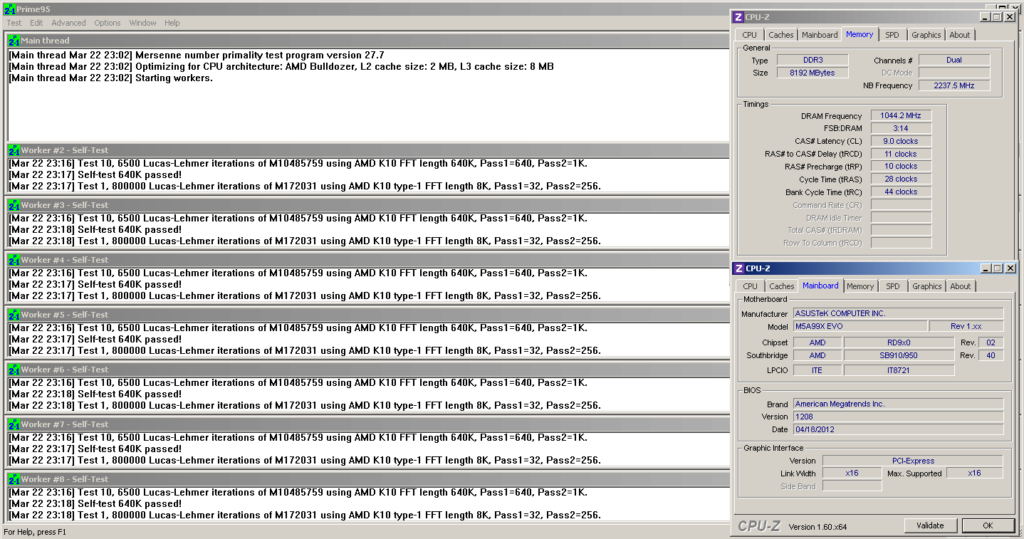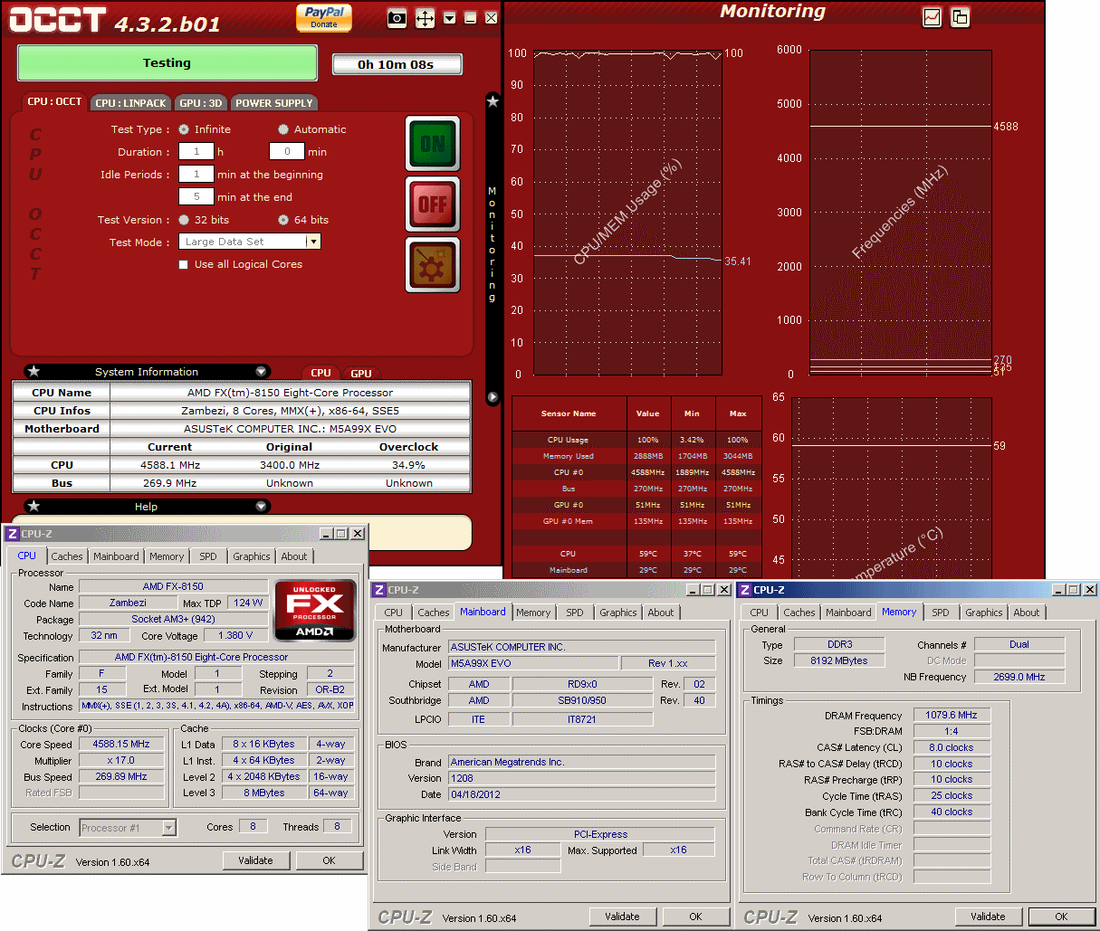 При этом на скриншоте видно, что максимальная зафиксированная частота – 4595 МГц, то есть хоть и в пределах погрешности, но на M5A99FX PRO R2.0 разгон чуть лучше, что подтверждает и возможность использования более высоких напряжений. Из интересного можно лишь отметить более высокие значения температур процессора на M5A99FX PRO R2.0, хотя это могут быть и просто различия в показаниях программного мониторинга.