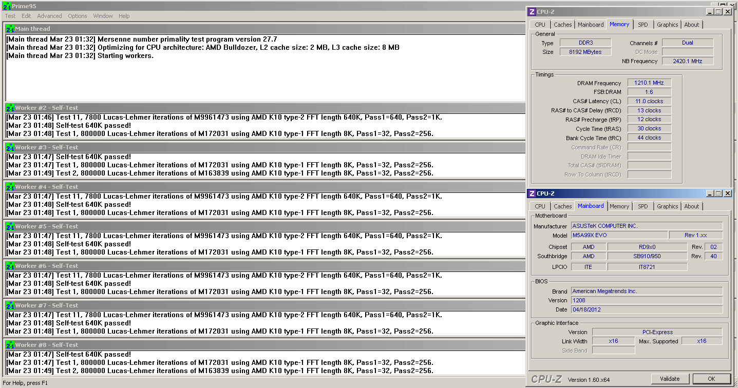 С комплектом Corsair CMX4GX3M2A1600C7 при таймингах 7-10-7 была достигнута стабильная работа на частоте 2112 МГц.