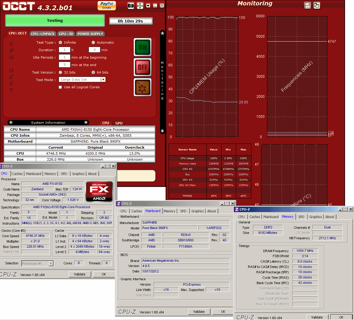 В итоге Sapphire Pure Black 990FX оказалась единственной платой, которая справилась с предельной нагрузкой. Видимо, это связано с тем, что она единственная в обзоре, у которой восемь фаз питания CPU VCore против шести у плат ASUS и ASRock и четырех у платы Biostar. Было решено остановиться на значении напряжения +193.75 mV (~1.53 В под нагрузкой по показаниям мультиметра и программного мониторинга), а итоговая частота работы процессора составила 4747 МГц.