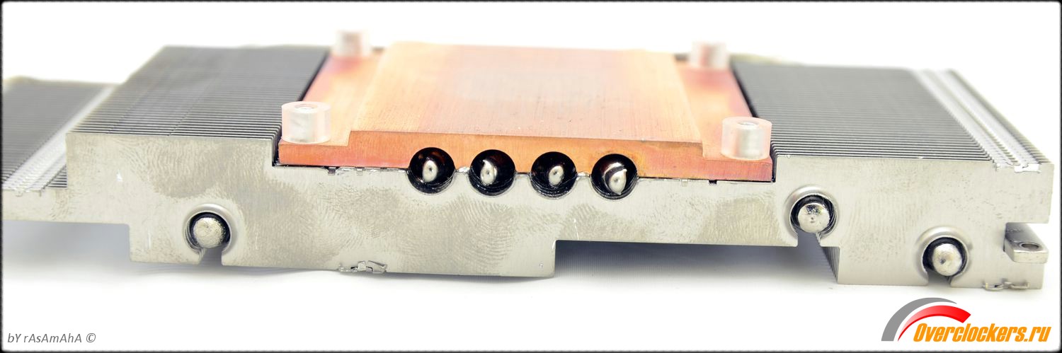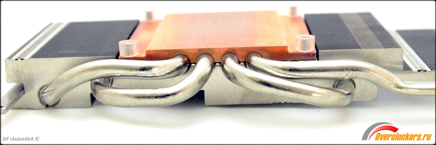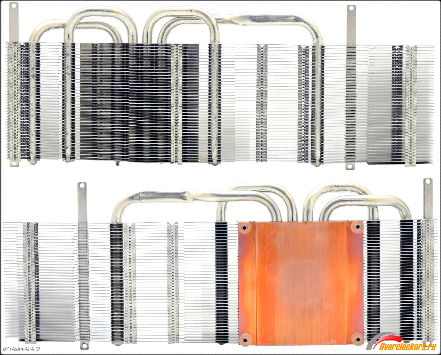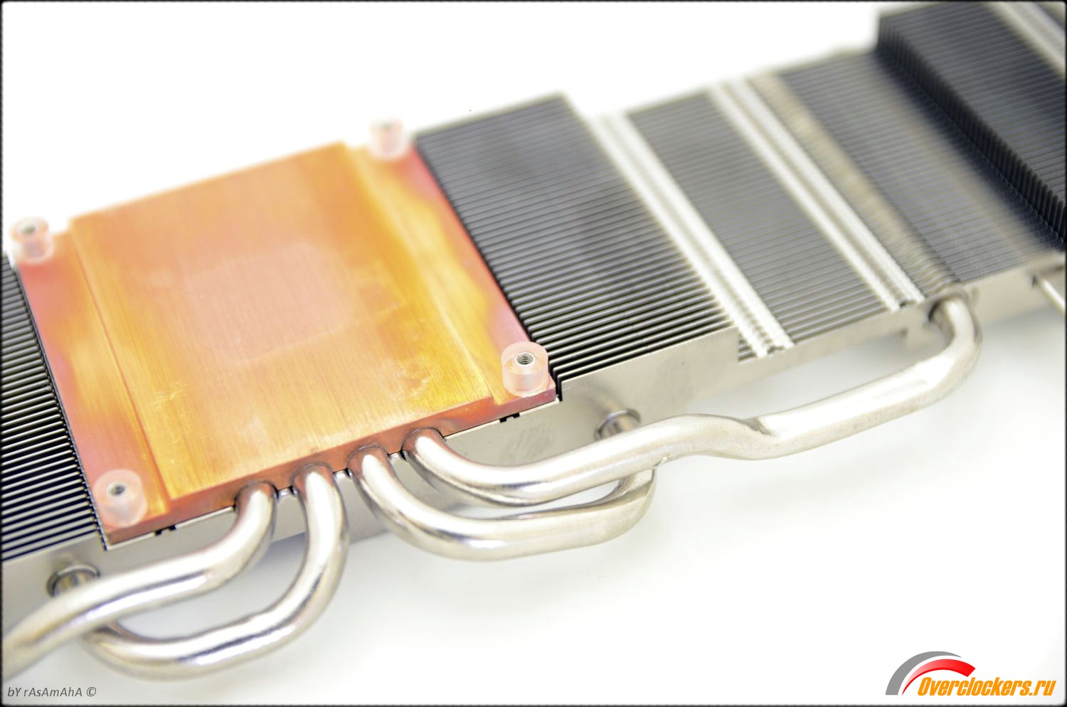 Под кожухом находится крупный радиатор, вытянутый на всю длину карты, в основании которого размещена медная вставка. В центре сделано четыре углубления под тепловые трубки, а сверху закреплена ответная часть. Тепловые трубки диаметром 6 мм расходятся по бокам, их крепление к ребрам радиатора плотное. Сами ребра соединены между собой замками.