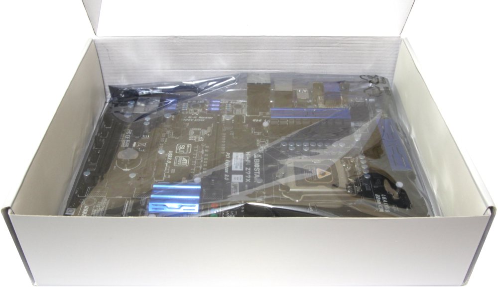 Сверху разместился комплект поставки на специальном лотке-разделителе из белого картона. Под всем этим богатством скрыта материнская плата в антистатическом пакете.