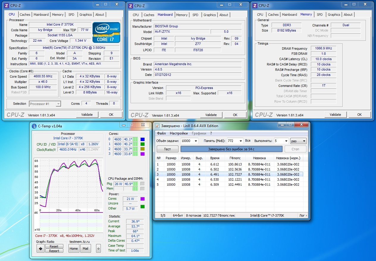 Сам производитель не позиционирует свой продукт как инструмент для разгона процессоров. Основной упор делается на звуковую часть, а силовая обвязка по сравнению с Biostar TZ77XE4 не изменилась. К тому же меню настроек BIOS не стало удобнее, поэтому ожидать чудес от платы Biostar Hi-Fi Z77X не приходится. Однако после недолгих манипуляций мне удалось добиться стабильной работы i7-3770K на частоте 4600 МГц.