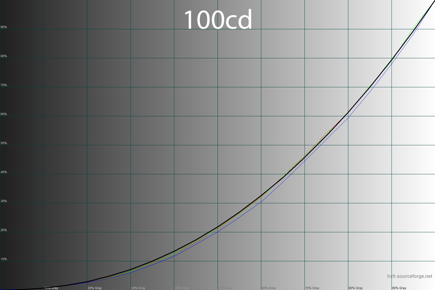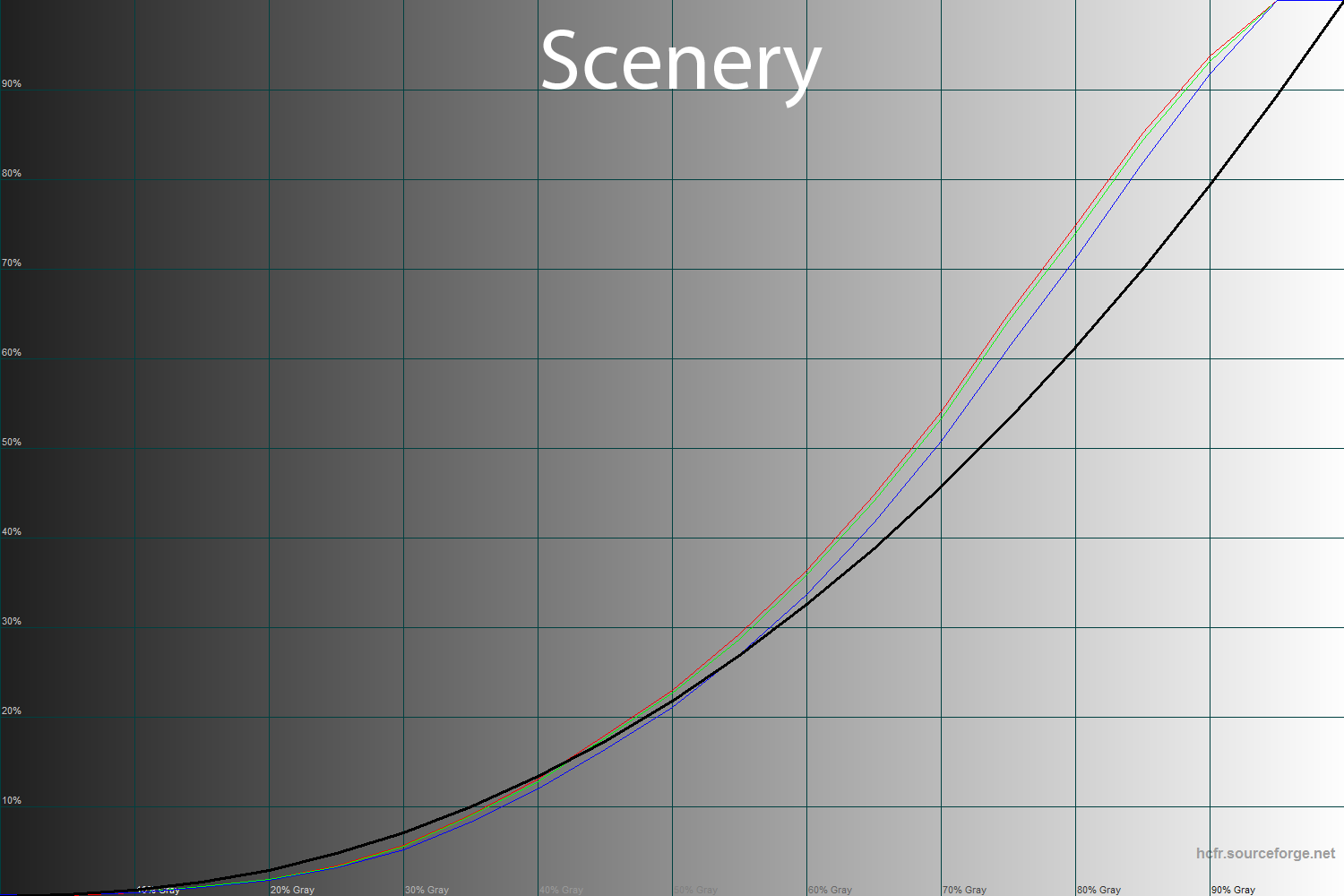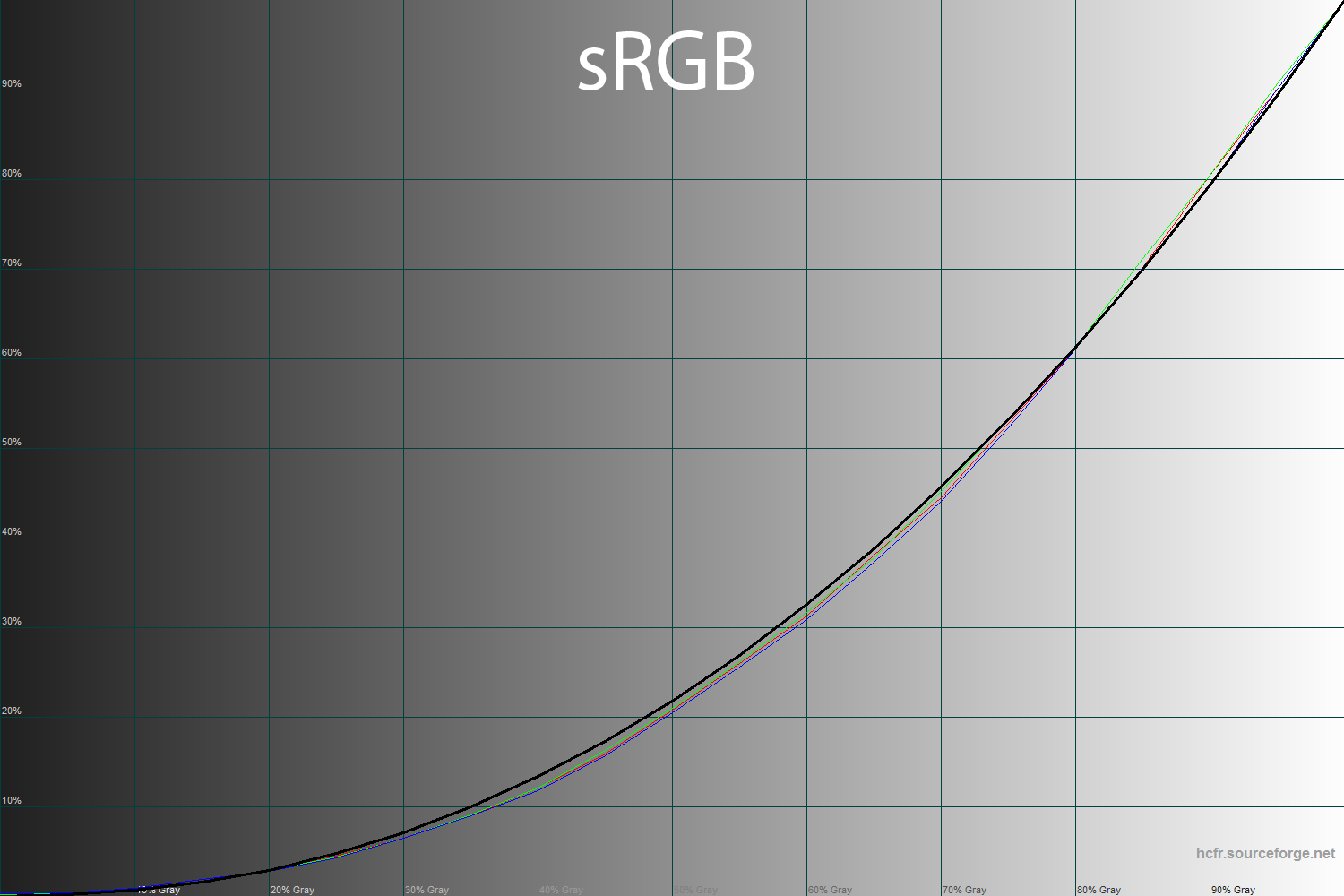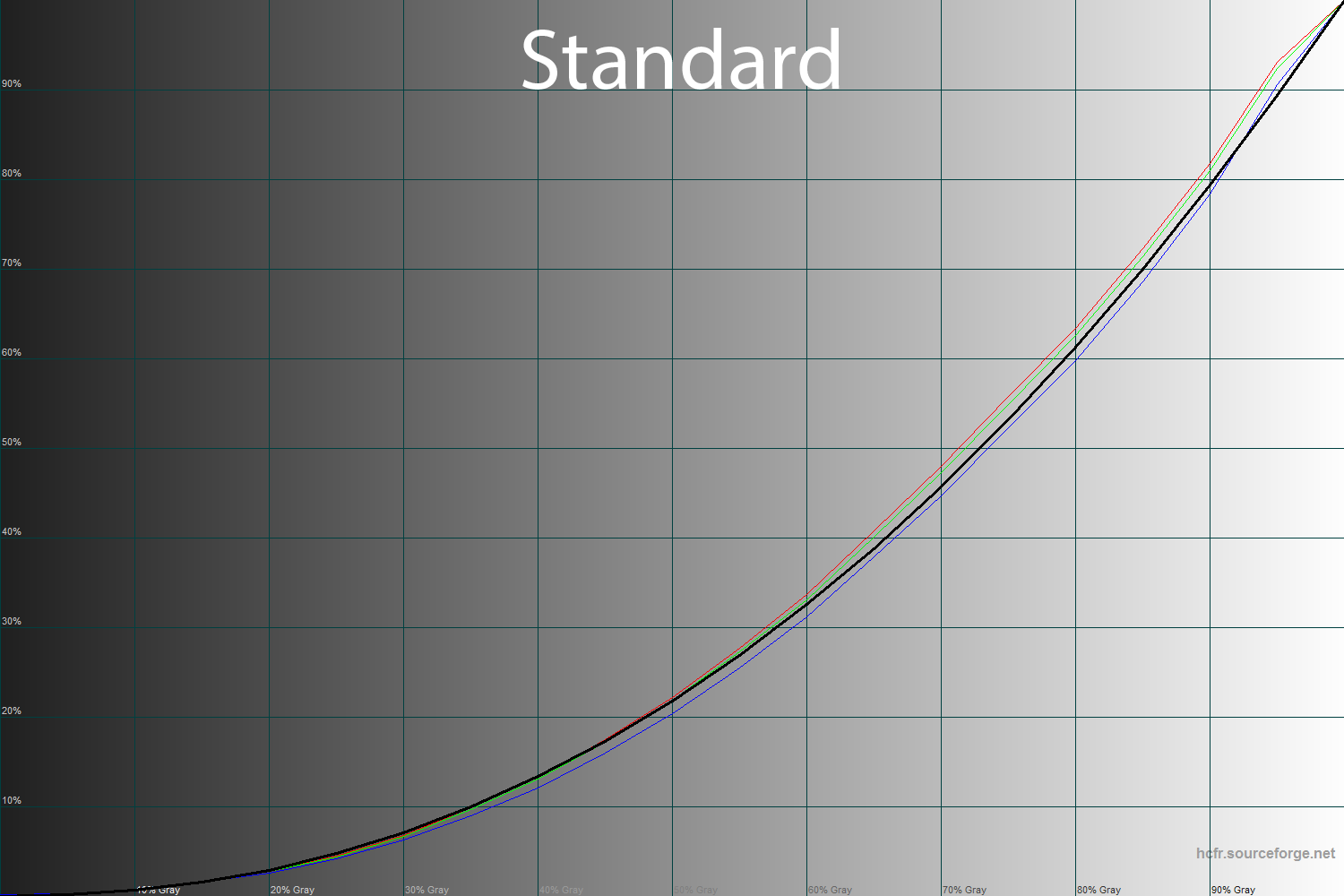 Полученные результаты гамма-кривых в режиме Standard подтверждают мои слова. Как видите, две линии проходят выше референса, а одна – ниже. Подобная компенсация приводит к запутывающему умы значению в 2.12, по которому многие бы просто сказали о недостаточно контрастной картинке. Именно поэтому изучение гамма-кривых – более предпочтительный вариант, чем суждения по среднему значению.
