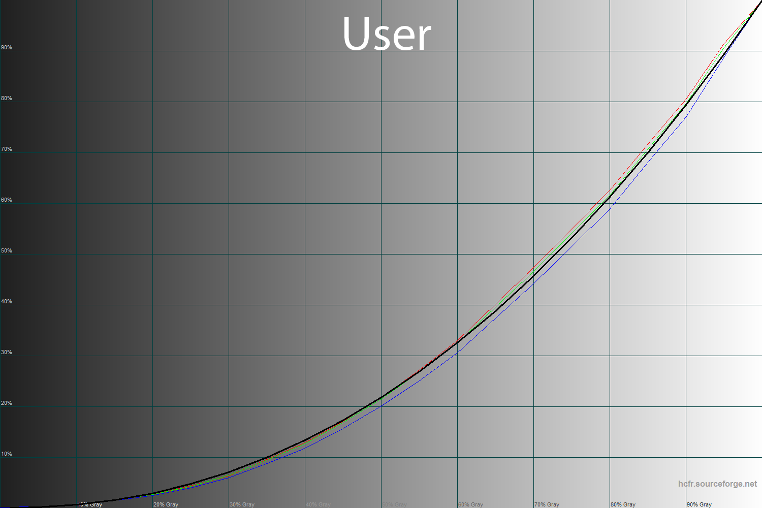Режимы Scenery и Theater не смогли порадовать меня своими гамма-кривыми. Сильный скачок в области 50% серого, который оканчивается перенасыщение всех оттенков в диапазоне 90–100% явно не идут на пользу цветопередаче. Проблемы с серым клином не решены, а в пресете Theater измеренные оттенки и вовсе ушли за пределы изучаемой области. Режим User в целом похож на Standard, а поэтому – без комментариев.