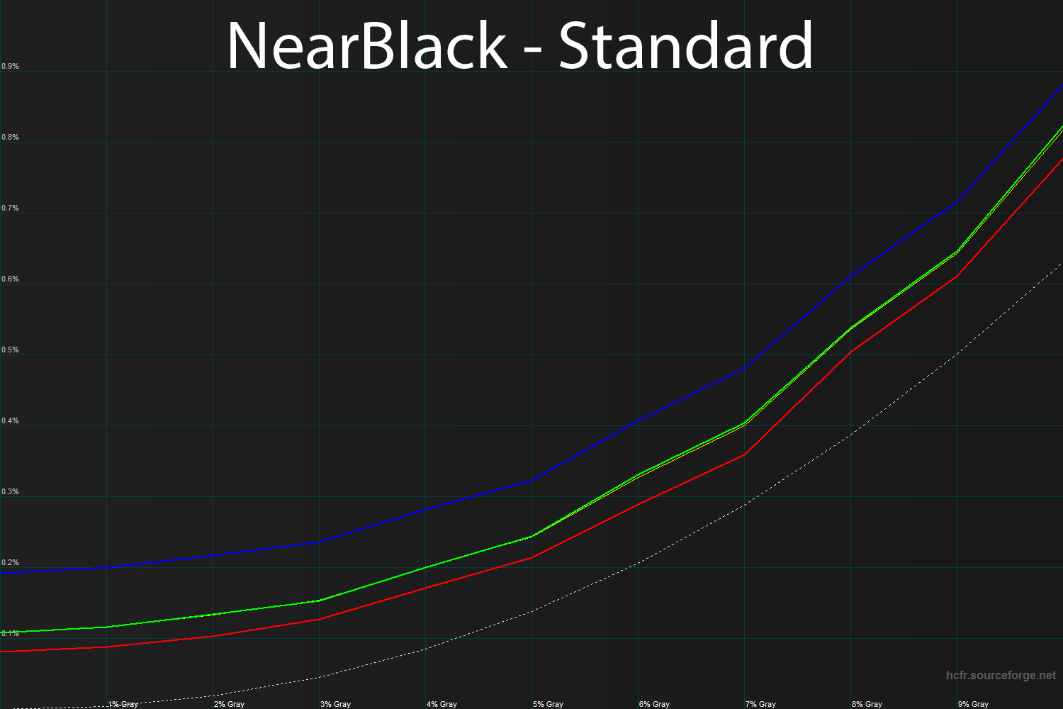 В данном случае из всего диапазона нас интересует лишь кривые в области от 0 до 3%. Именно в ней находятся изучаемые оттенки со значениями RGB от 0 до 8 (а если быть точным, то 255*0,01=2,55*4=7,65). Как видите при настройках по умолчанию минимальный подъём (рост яркости) наблюдается только с 2%, а если судить по факту, то такая разница на глаз и вовсе не различима. Производимая по стандарту калибровка (с использование Extended – расширенной калибровочной таблицы) не предполагает глубокое изучение и последующие изменения в тёмных оттенках. Таким образом, методом проб и ошибок я пришёл к тому, что в случае с ASUS PB278Q (и по всей вероятности это относится к любым PLS дисплеям) необходимо “поднять” в настройках Argyll точку чёрного на 10%, чтобы вывести монитор в правильное русло. Итогом проделанных действий стало изменение гамма-кривых и соответствующая различимость на глаз оттенков начиная с RGB со значением 3. Это достойный результат, на котором можно остановиться, так как дальнейшее увеличение различимости