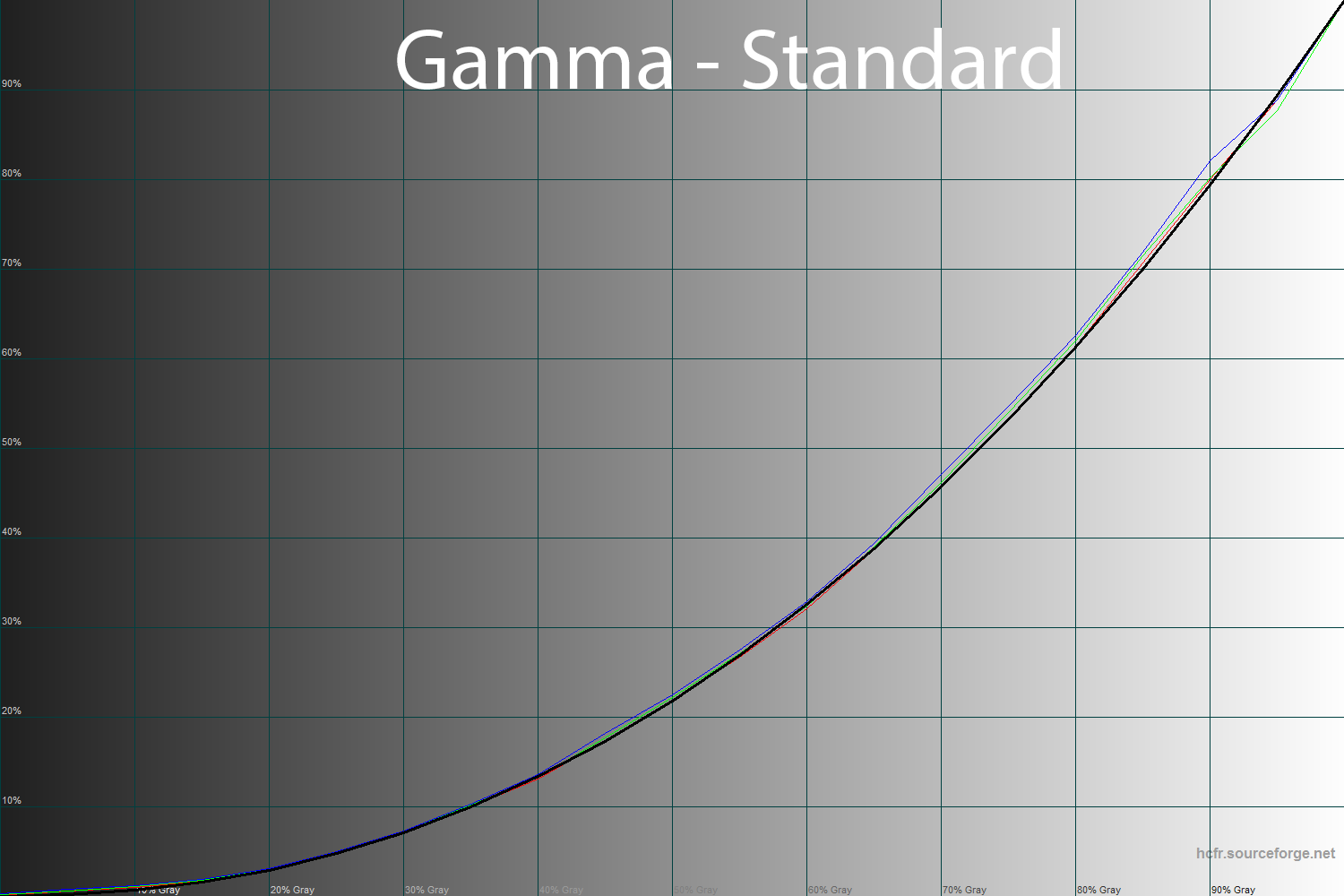 С помощью программы HCFR Colormeter и откалиброванного колориметра X-Rite Display Pro мною были изучены гамма-кривые во всех рассмотренных выше режимах, как изначально предустановленных, так и специально разработанных. Кроме того, по произведенным измерениям можно оценить расхождение серого клина (точек черно-белого градиента) на CIE диаграмме и сделать выводы о преобладании того или иного паразитного оттенка, либо его таковом отсутствии.