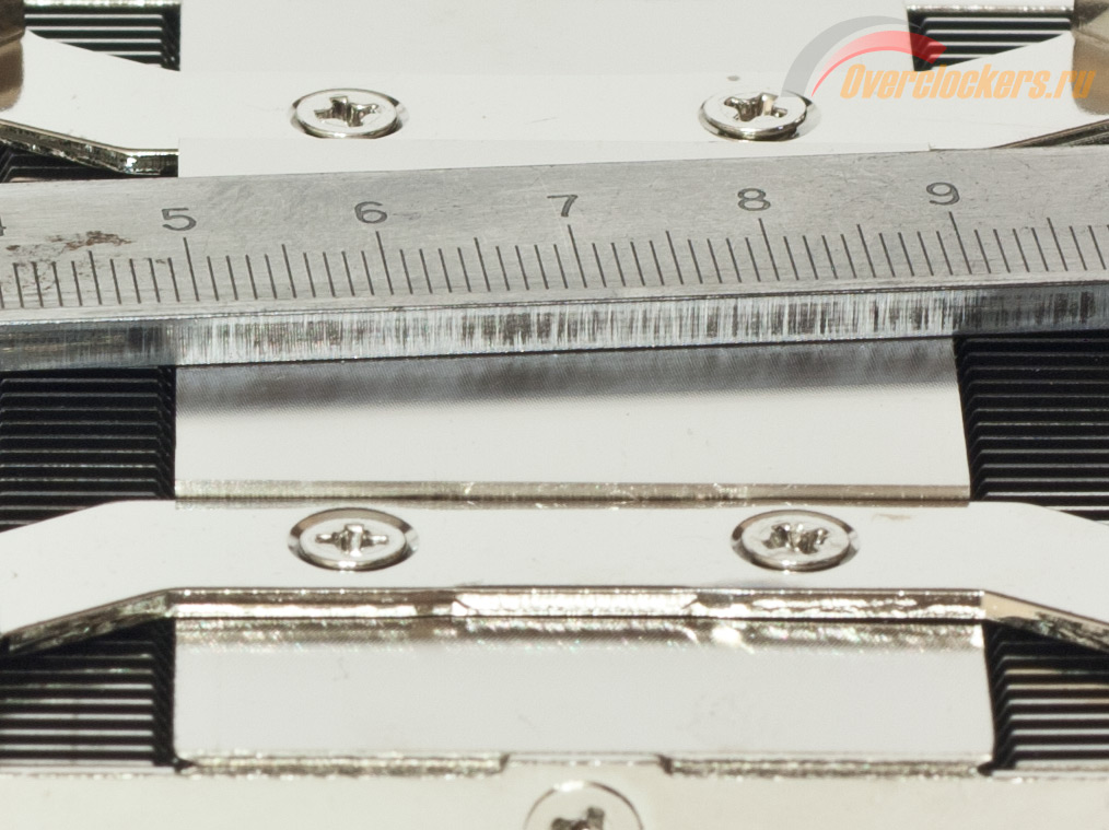 Что касается подошвы радиатора то здесь все отлично. Основание ровное. Несмотря на присутствие незначительных следов шлифовки, какие-либо выгибы или неровности основания отсутствуют.