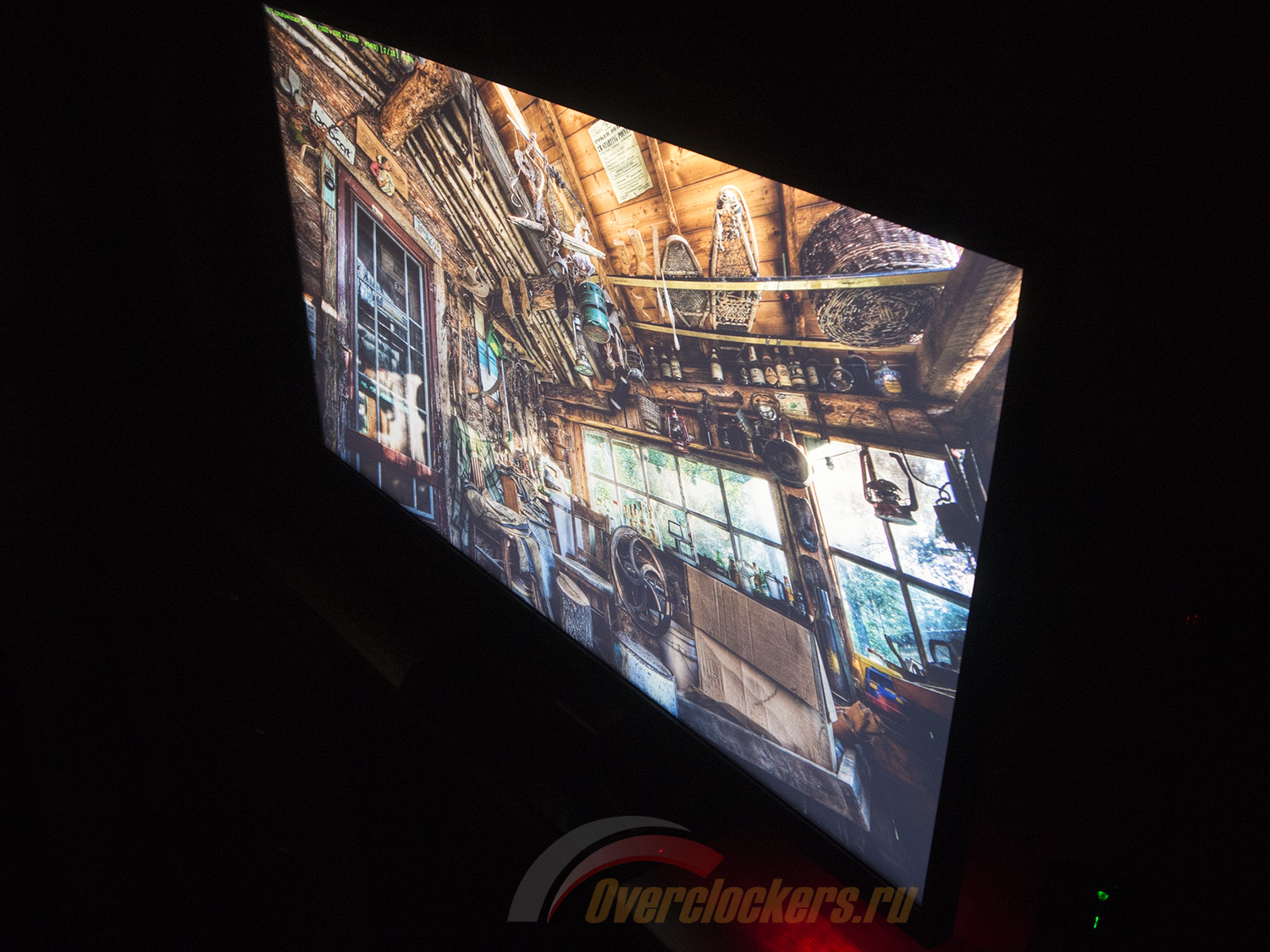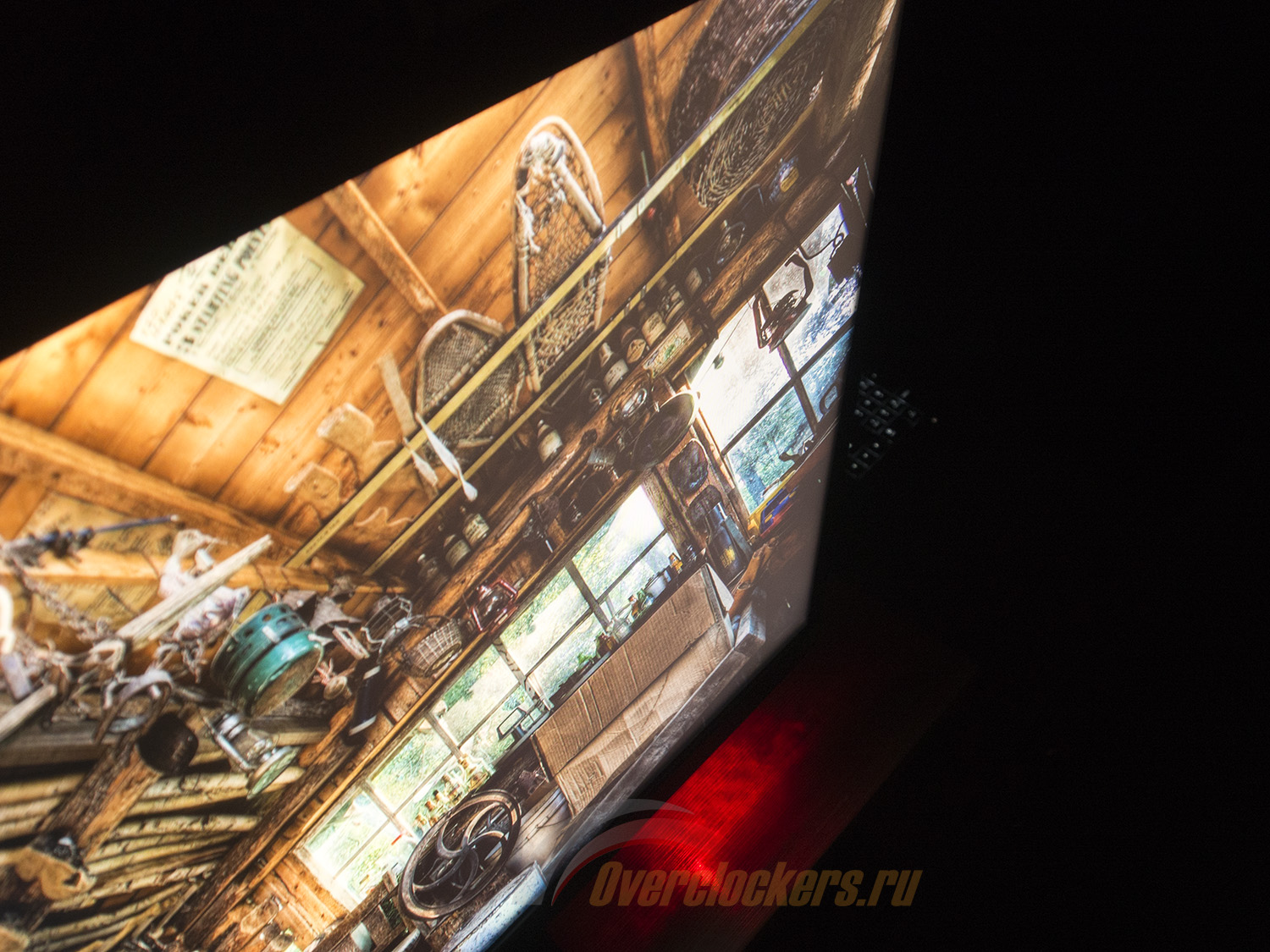 Быстрее всего рассмотреть данную особенность можно, взглянув на угол экрана, находясь где-то в стороне от монитора в темное время суток. Фотография наглядно демонстрирует то, что вы должны увидеть. Также по ней можно судить об отсутствии паразитных оттенков при просмотре изображения под углом. Фактической разницы в сравнении с конкурентами при одинаковых настройках нет.
