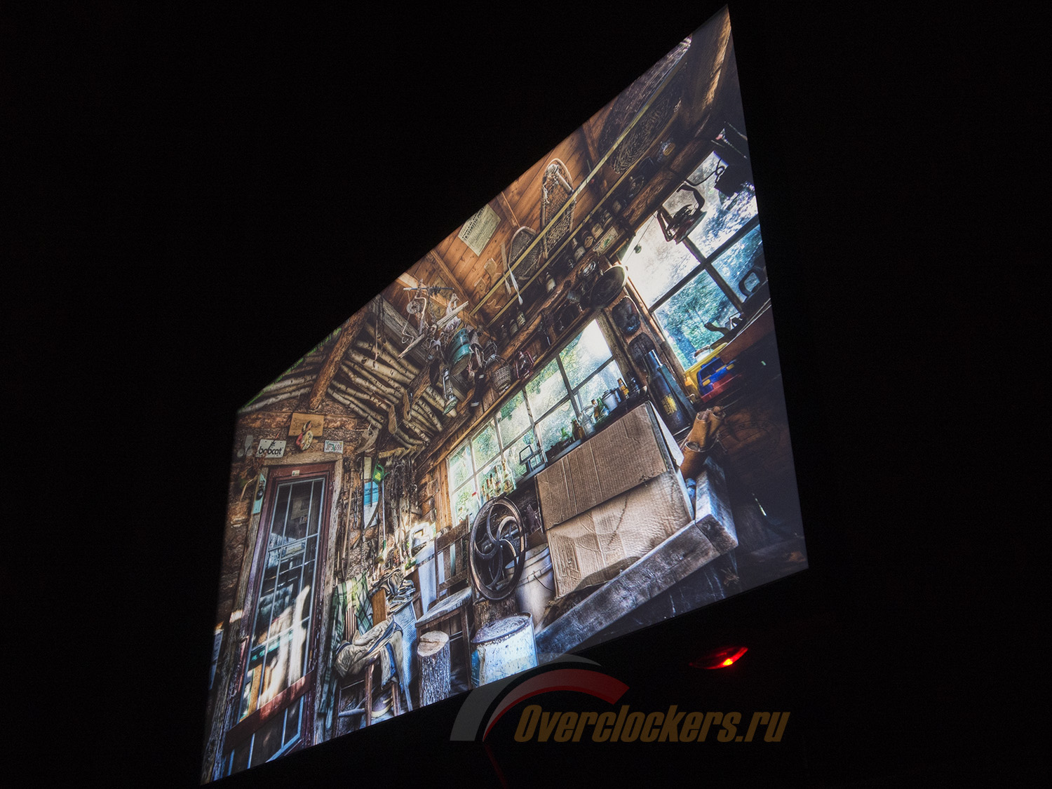 При диагональных углах обзора наблюдается снижение куда более заметное контрастности, изображение покрывает этакое белое облако. При просмотре снизу этот эффект проявляется не так сильно, но при этом картинка становится явно темнее, особенно в тенях.