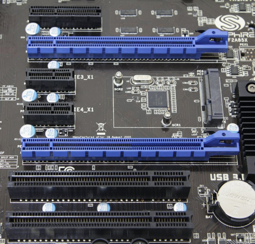 Кроме вышеупомянутых интерфейсов присутствуют два разъема PCI-e x1, два простых PCI и один PCI-e x4, распаянный в самом верху. Он примечателен еще тем, что не содержит ограничителя. Иными словами, в него можно установить адаптер x8 или x16, но работать он будет только на скорости x4. И хотя компания AMD нигде особо не афиширует этого, но в ее процессорах по-прежнему используется второе поколение шины PCI-e. Таким образом, две видеокарты, работающие по схеме x8+x8 Gen 2 – совсем не то же самое, что x8+x8 Gen 3 на чипсете Intel Z77 с процессором поколения Ivy Bridge.